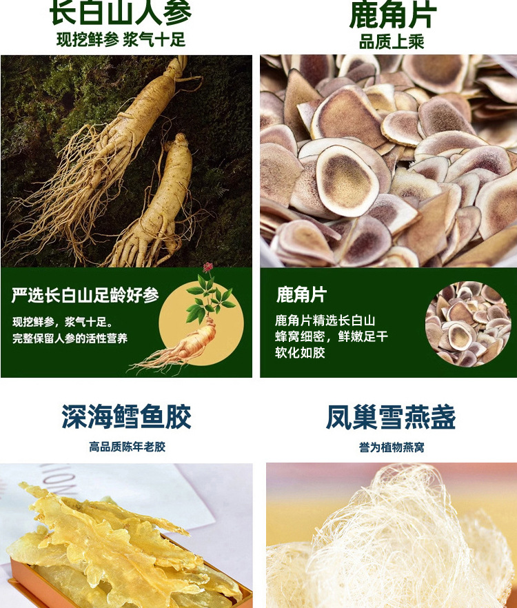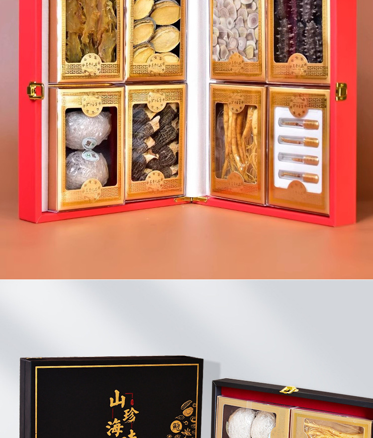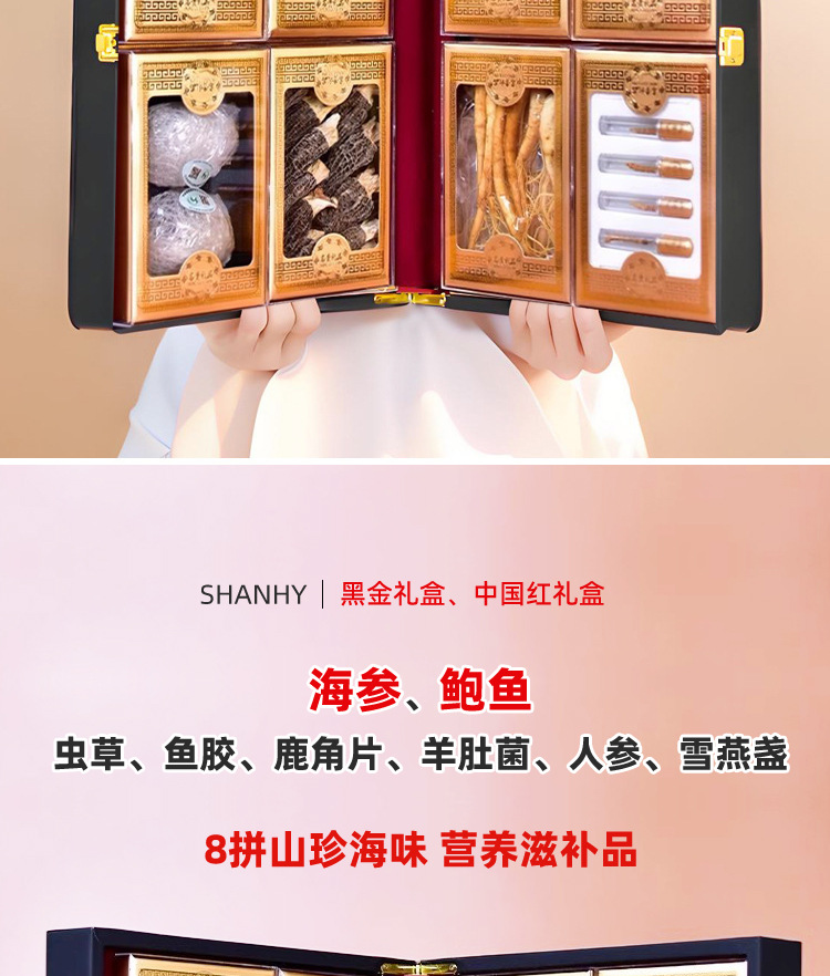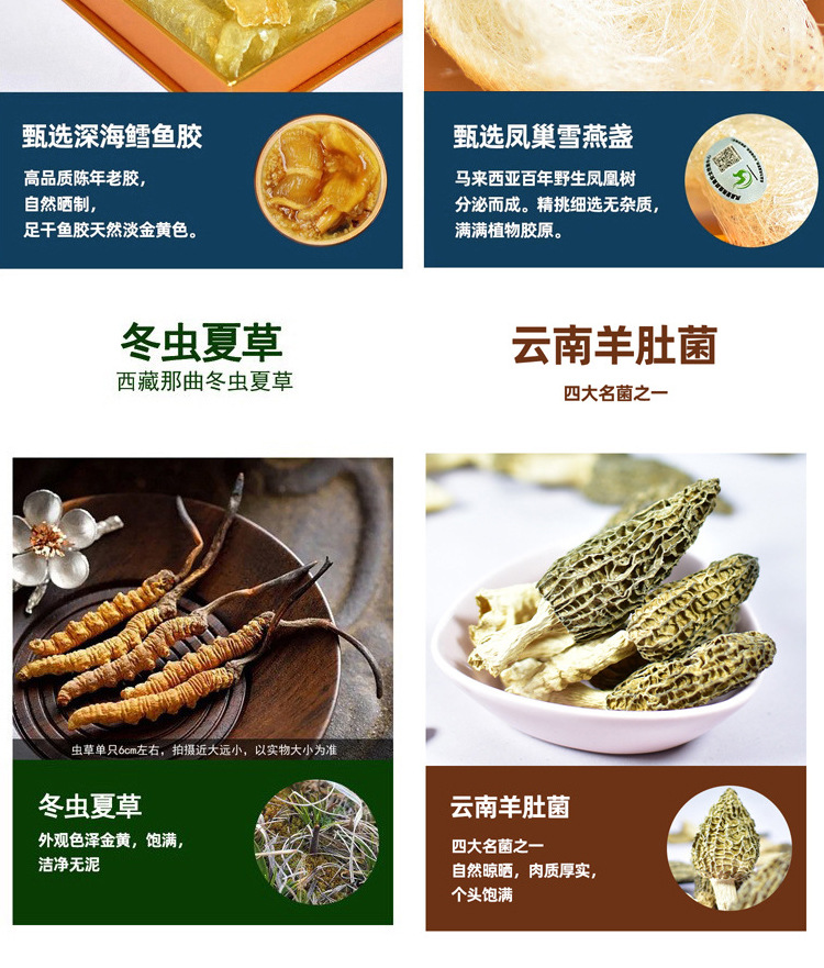 内盒含有:海参、鲍鱼、鱼胶、冬虫夏草、鹿角片、羊肚菌、人参、雪燕盏