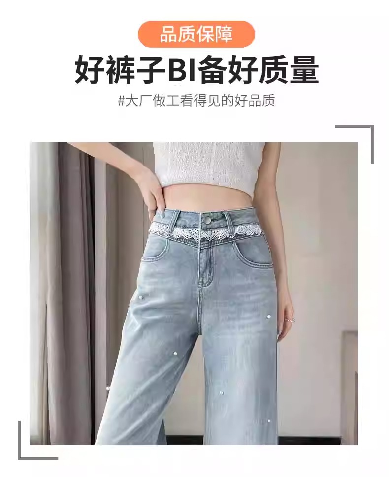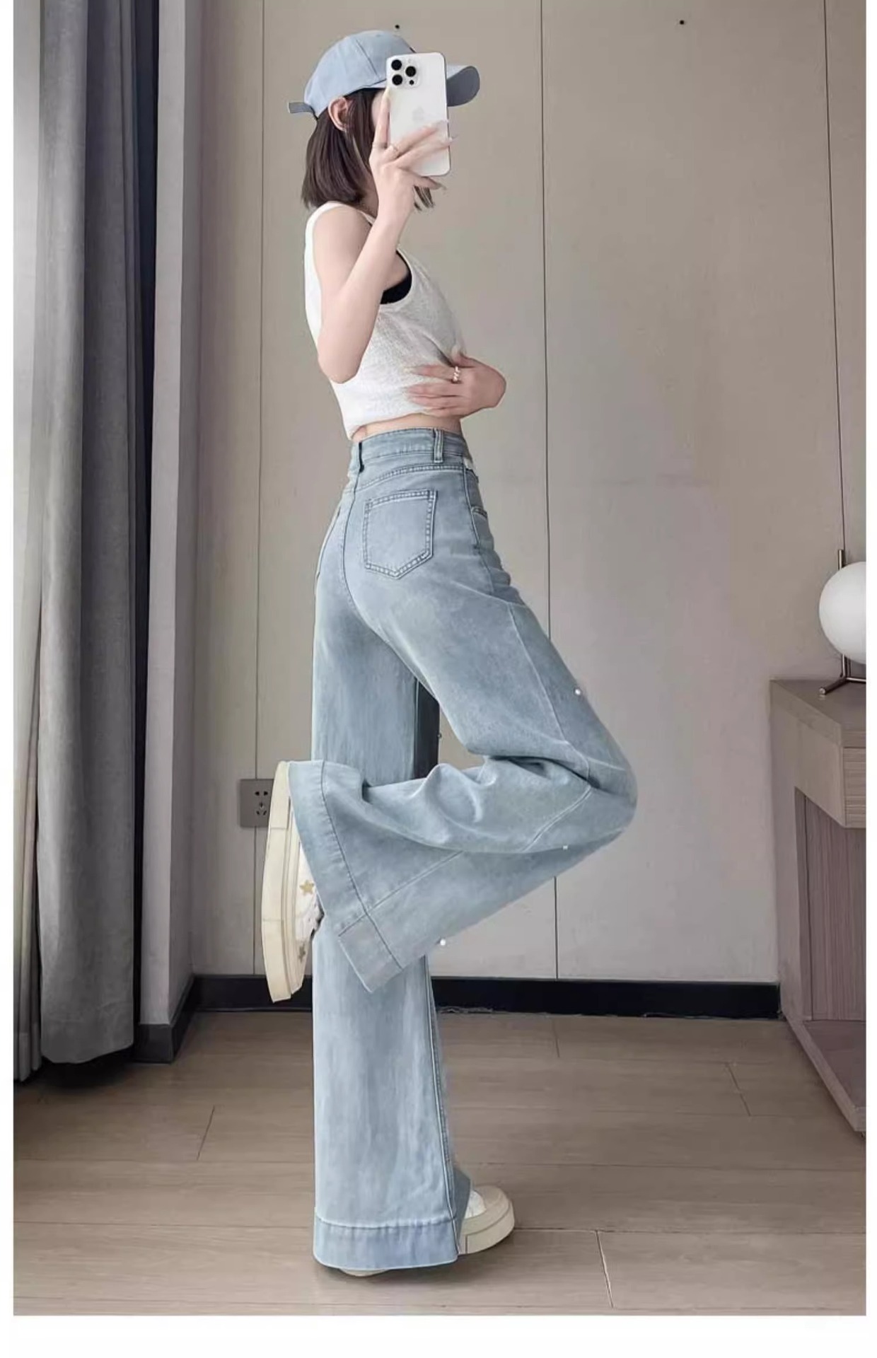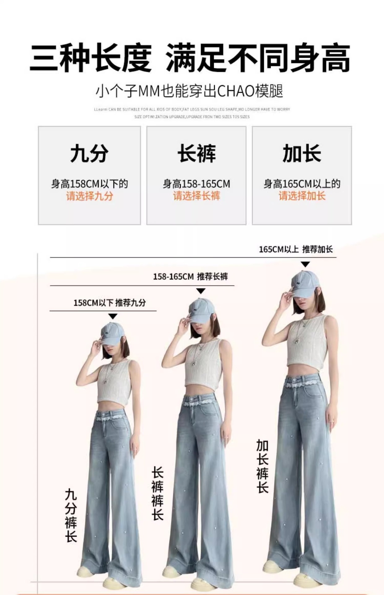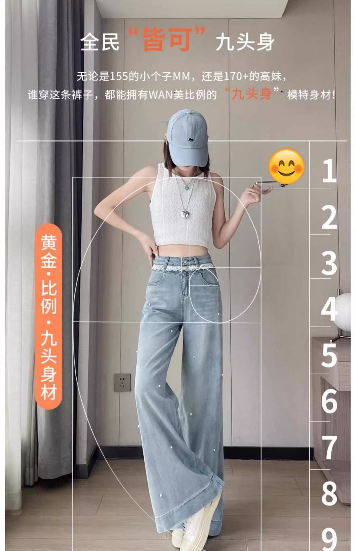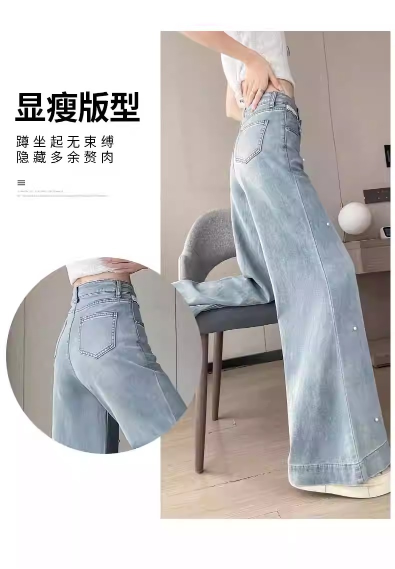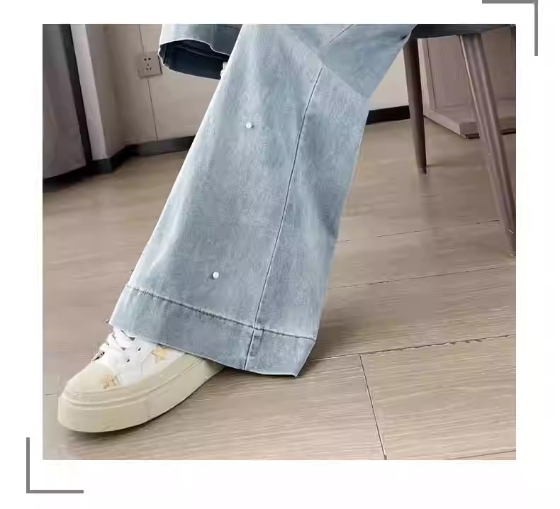 ゆったりとした広脚のラッパのジーパンの女性2025の新型の春の服の双ボタンの高い腰の立体は小さい背の小さいレギンスをつなぎ合わせます。
