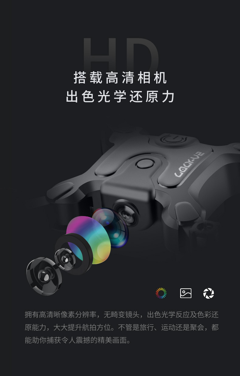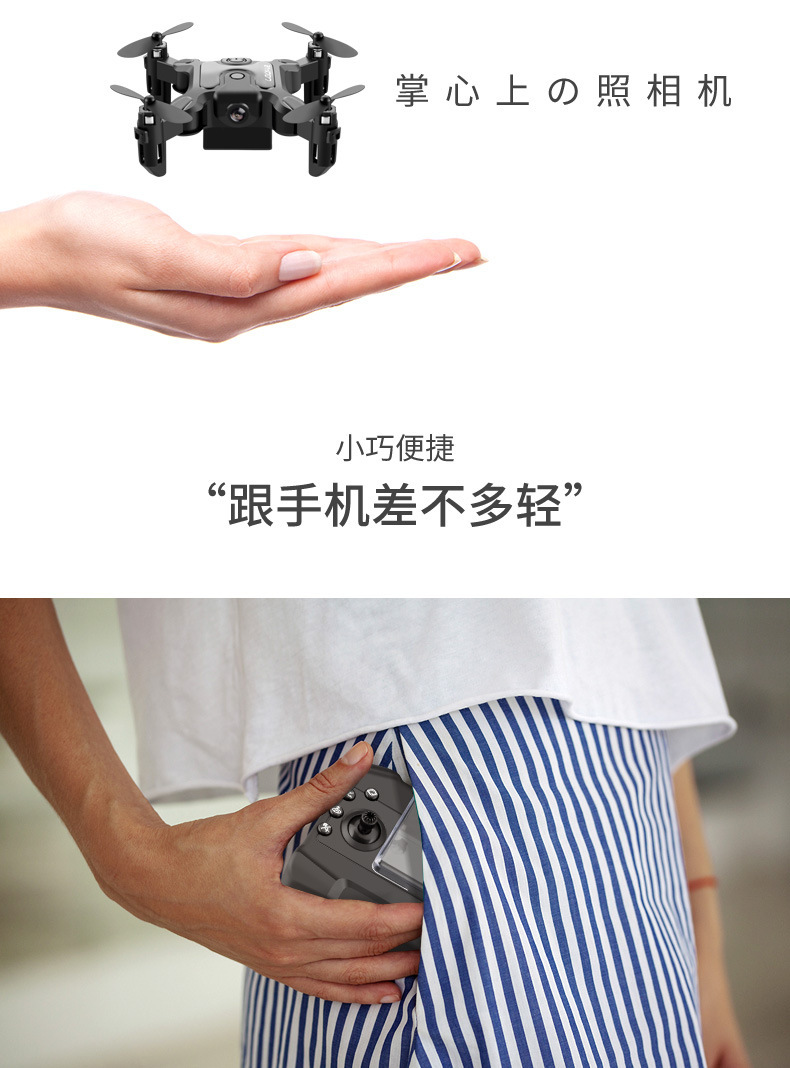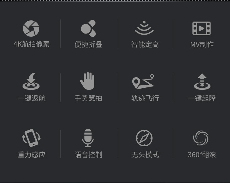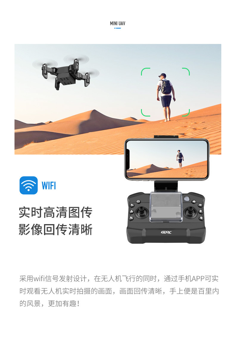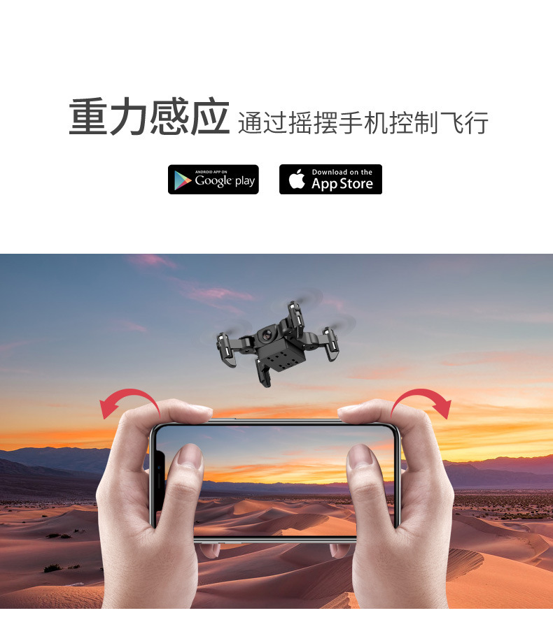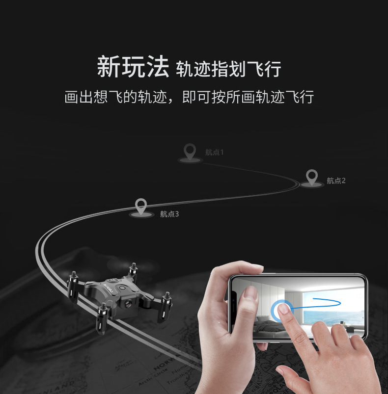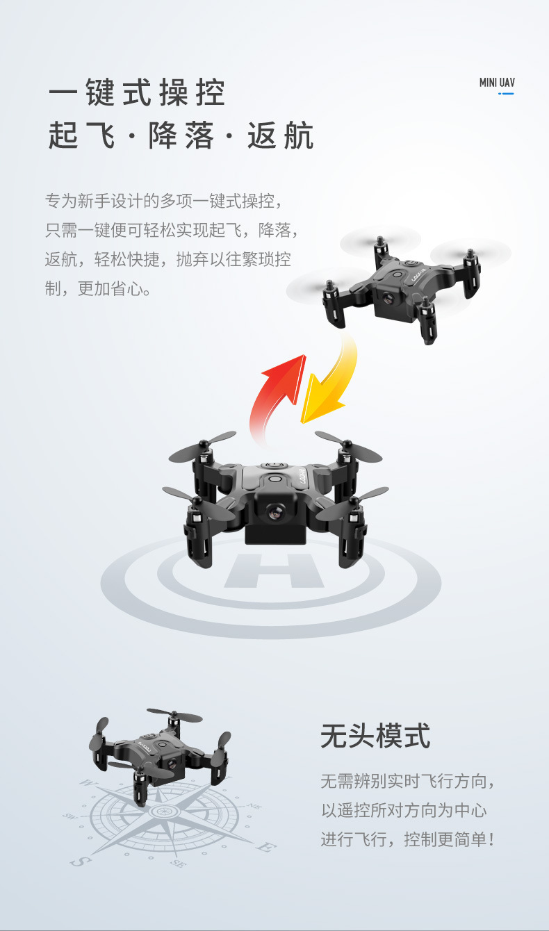 前进 后退 左转 右转 左侧飞 右侧飞 一键翻滚,360度花样翻滚 指南针无头模式,一键返航轻松召回 手机WiFi操控,手机屏幕实时传输 定高模式,飞行/悬停稳定, 降落平稳 可折叠机身,体积小,方便携带 自拍功能 创新航拍新模式