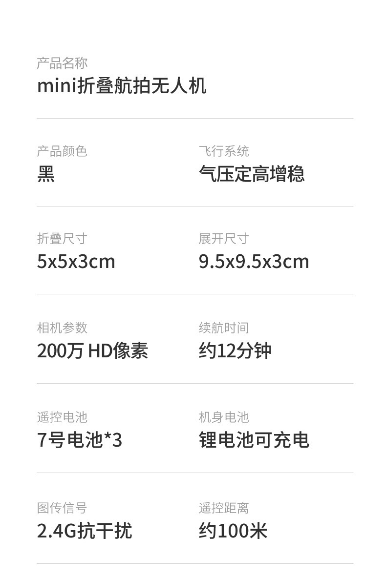 外观 折叠飞行器 遥控器电池 2*AAA(需另购)