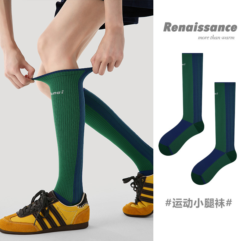 小腿袜子女款纯棉秋冬季长筒袜拼接黑灰色微压显瘦长袜高筒袜批发