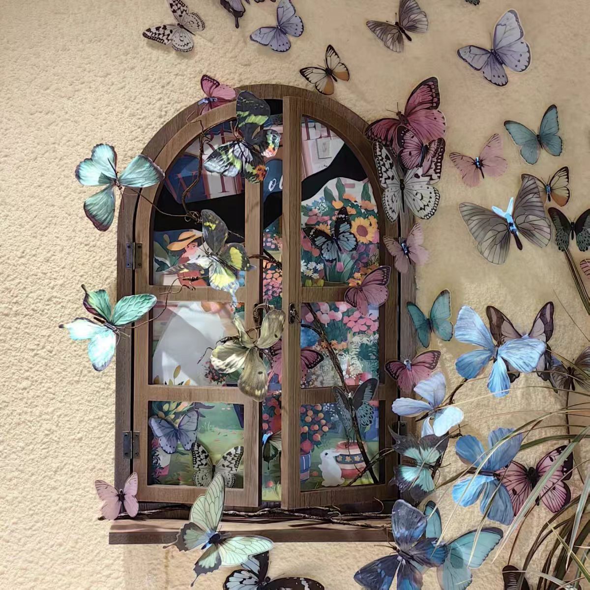 3D蝴蝶仿真墙贴假窗户木板展示板卧室玄关背景墙面装饰品ins