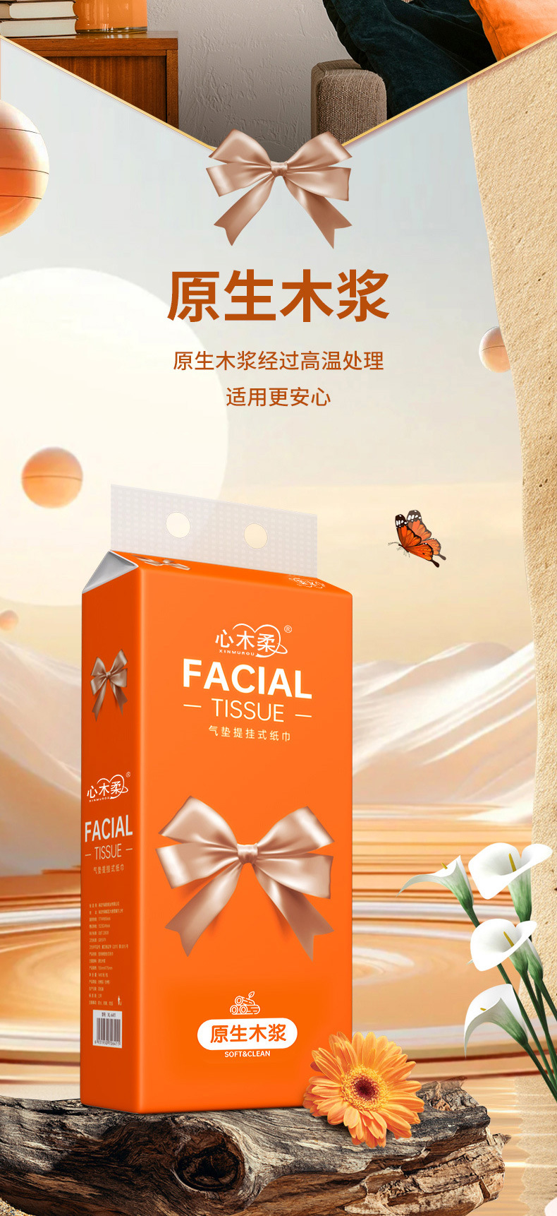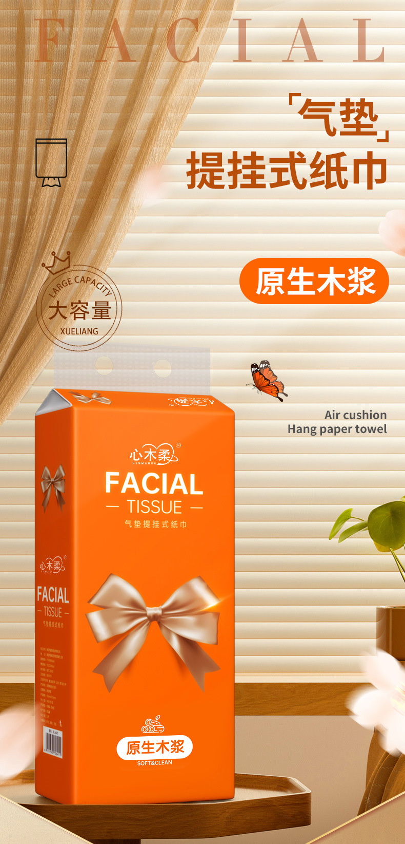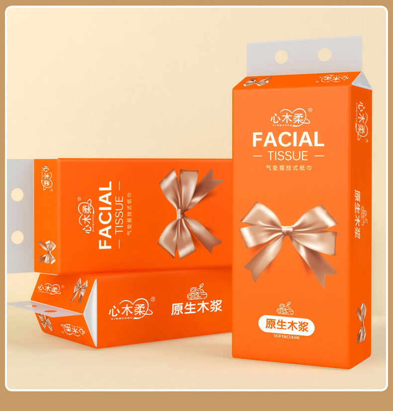 雪のように白く輝くリボン付き吊り下げ式ティッシュペーパー、ボトムティッシュ、フェイシャルティッシュ、ナプキン、フラットティッシュペーパーの抽出器