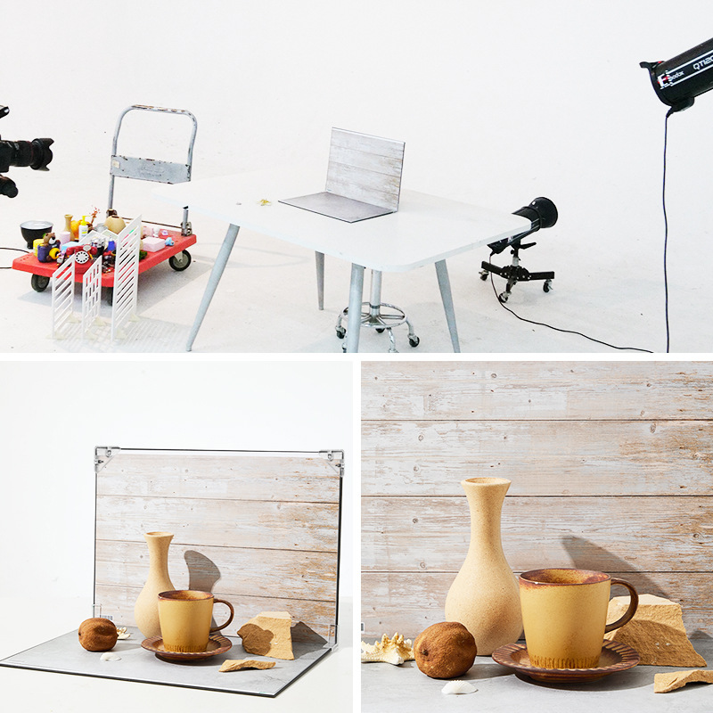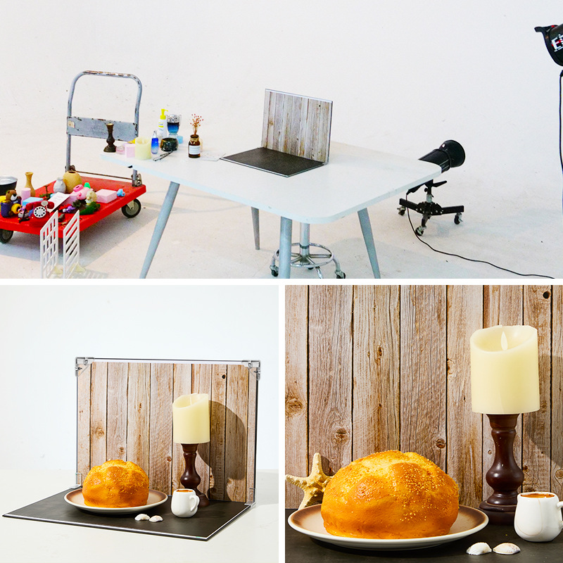両面グラデーション背景紙を並べてグルメアクセサリーを撮影します。