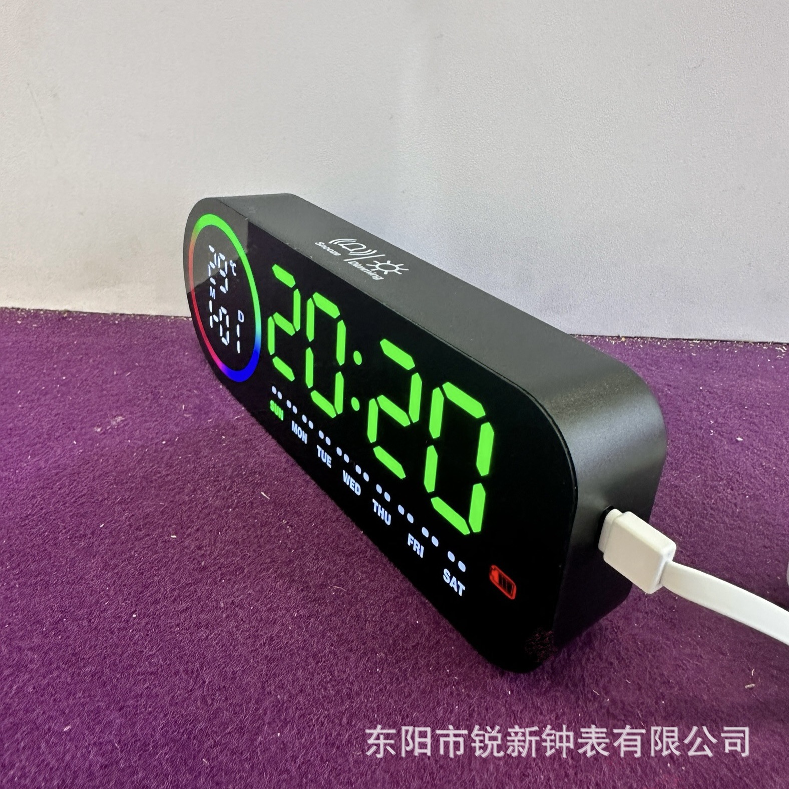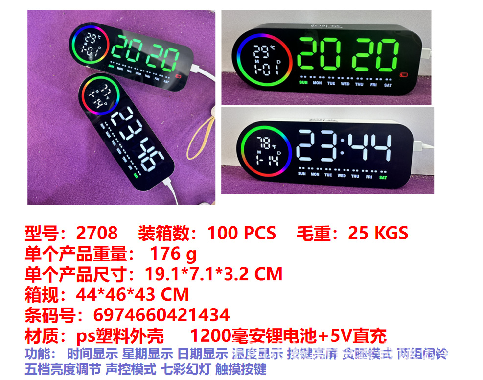 厂家直销多功能七彩幻灯闹钟时钟五档亮度声控触摸星期日期温度
