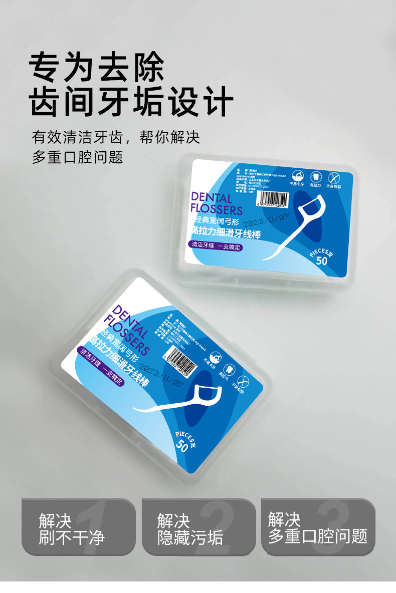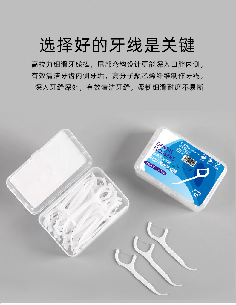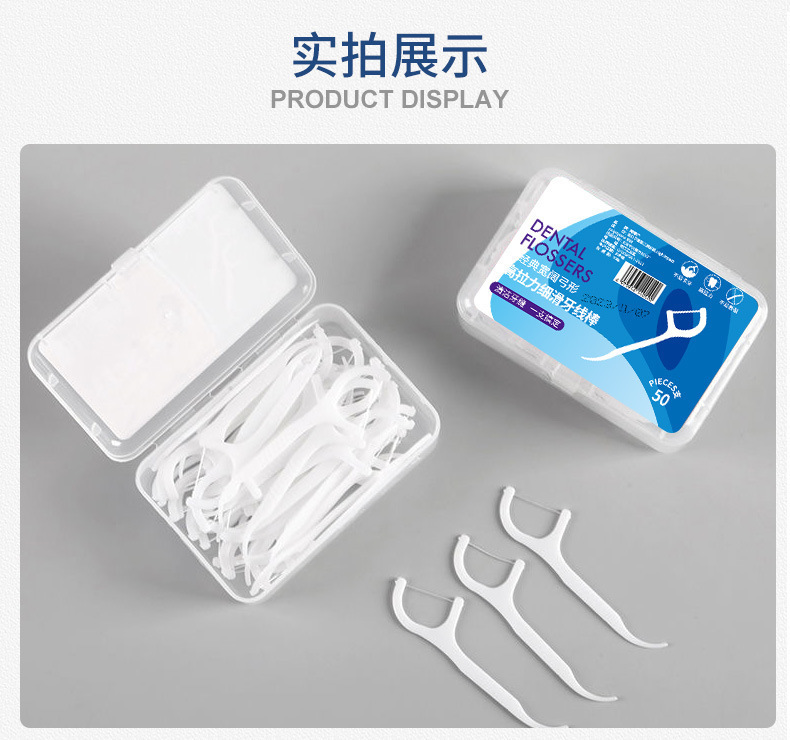 商品名 デンタルフロス 50 個ボックス、使い捨て、ポリマーフロスピック、ファミリーパック、高度な独立包装、ポータブルクリーニング、卸売、サポートドロップシッピング、ソースメーカー、