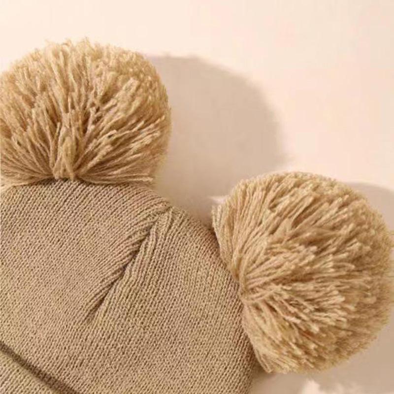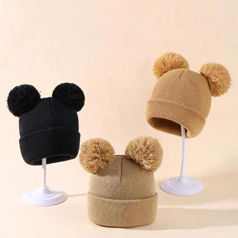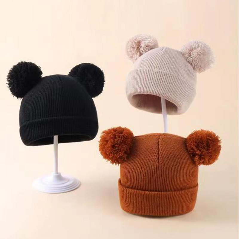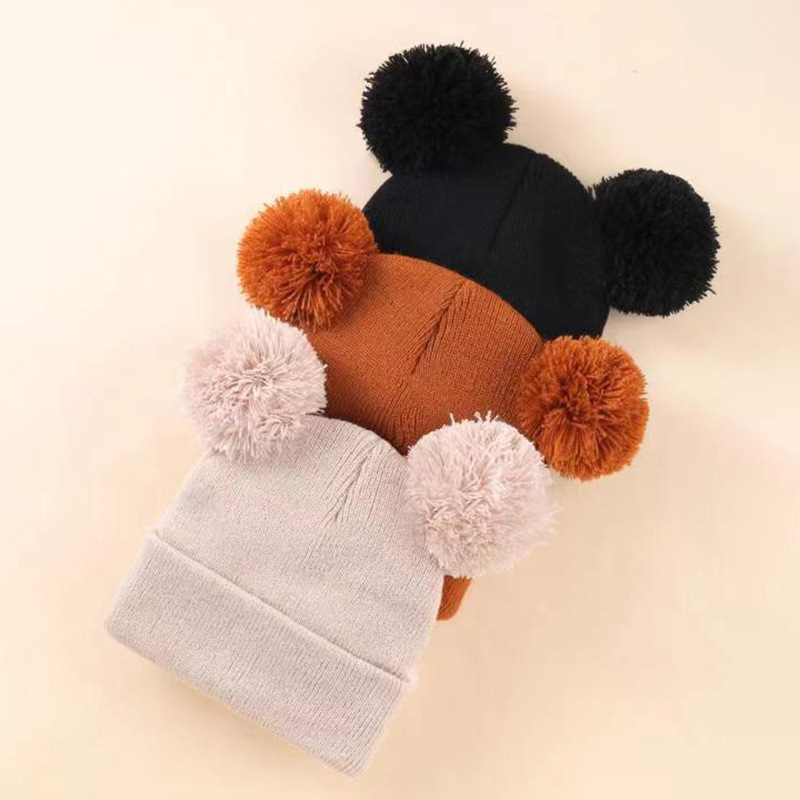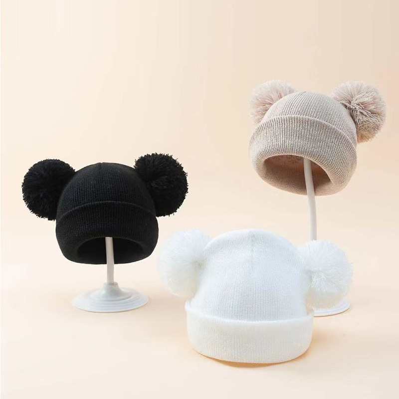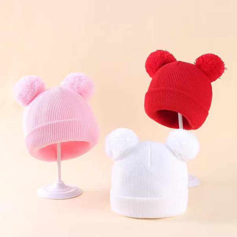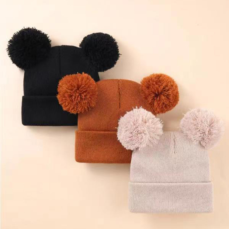 跨境新款儿童针织帽婴儿毛线双球帽子纯色保暖套头帽宝宝秋冬帽