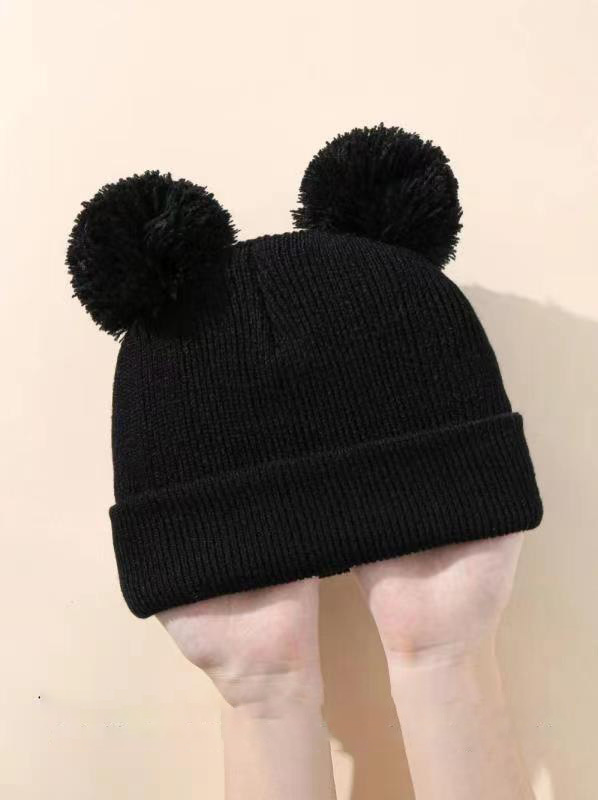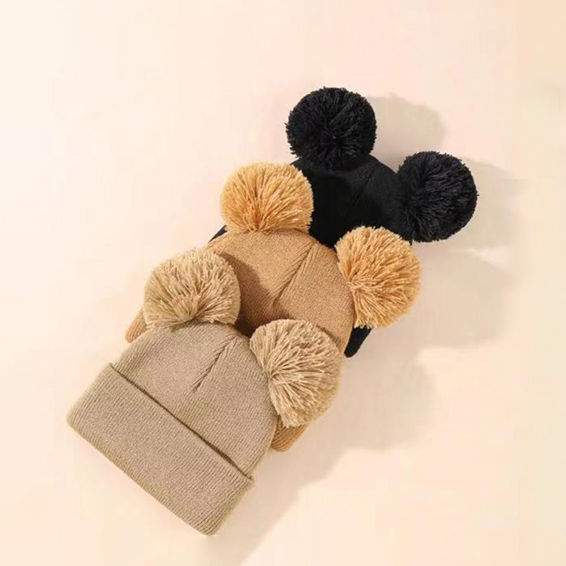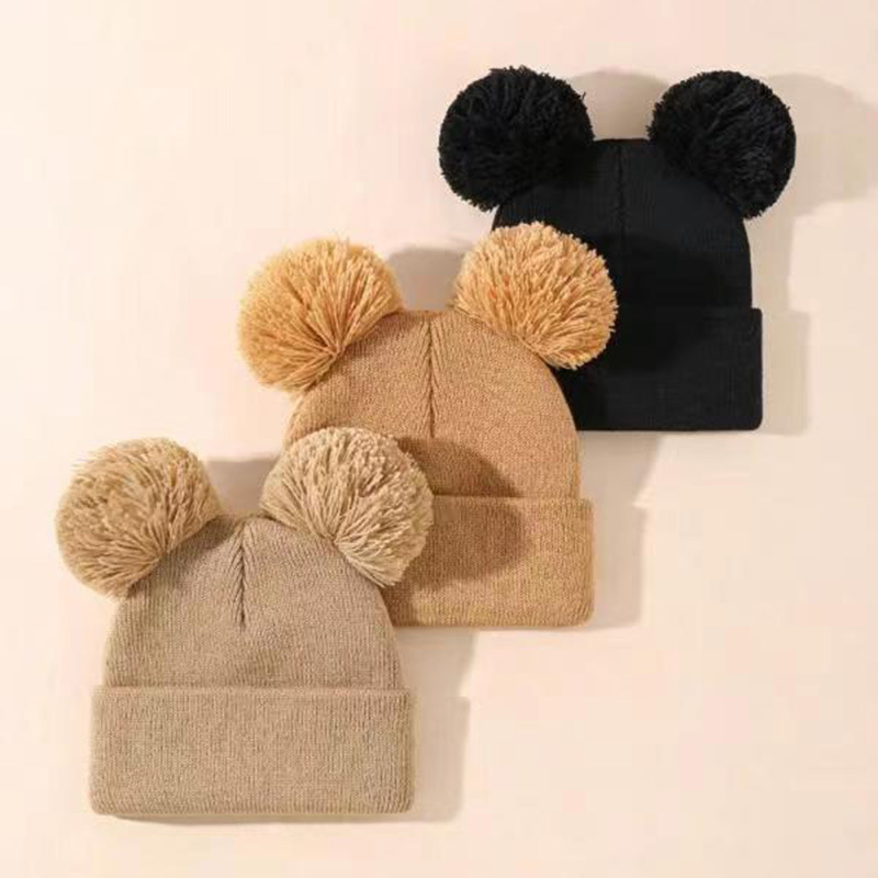 跨境欧美带双毛球儿童针织毛线帽男女宝宝可爱纯色保暖护耳套头帽