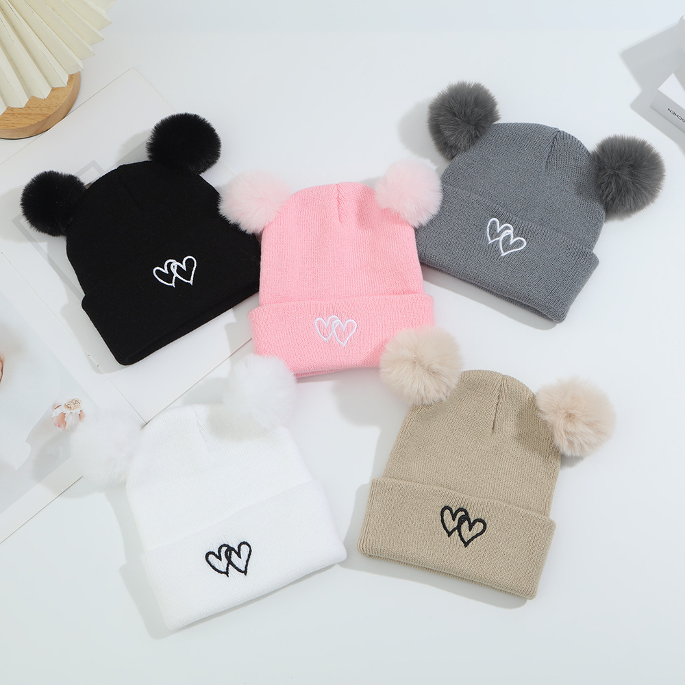 可爱婴儿针织帽双爱心刺绣双绒球毛线帽宝宝舒适亲肤保暖御寒帽子