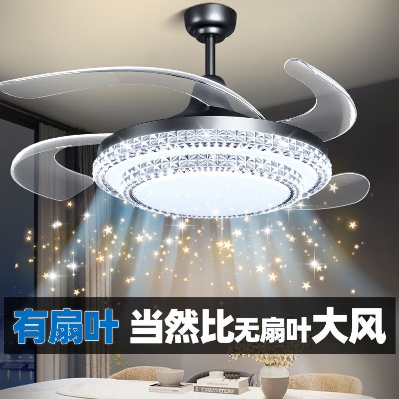 万能水晶ファンランプE27口ファンシャンデリア一体知能リモコン水晶ランプ家庭用寝室キッチンランプ