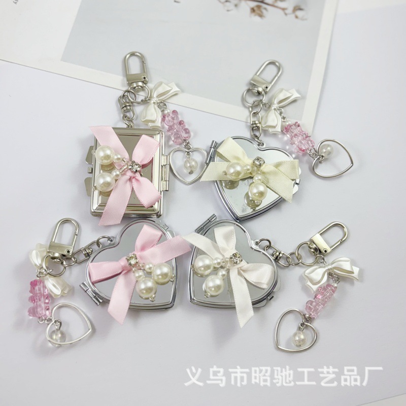 韩国彩色蝴蝶结爱心镜子钥匙扣 圆形镜子小众包包挂饰 双面心形镜