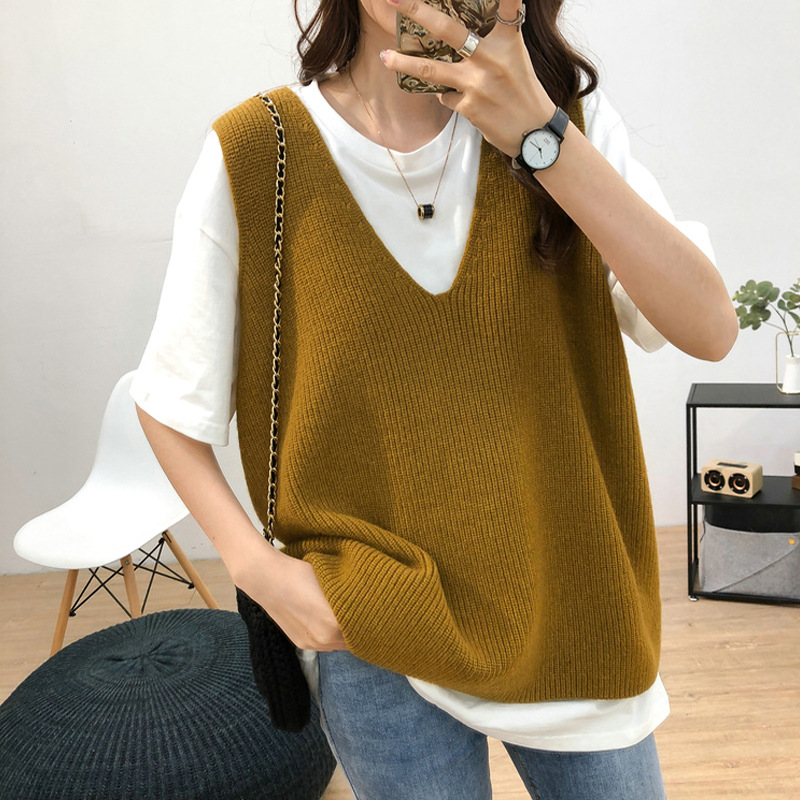 ニット馬甲女秋冬女装新韓国版怠惰風カジュアルゆるいvネック純色セーターベスト女