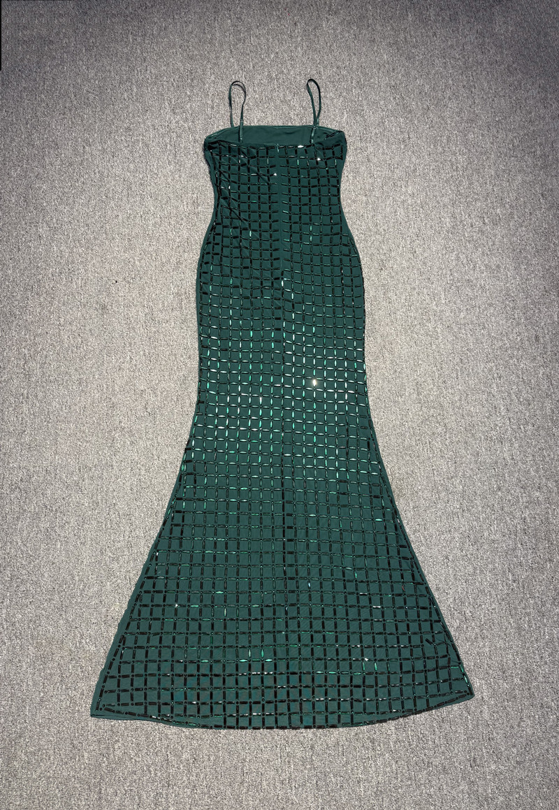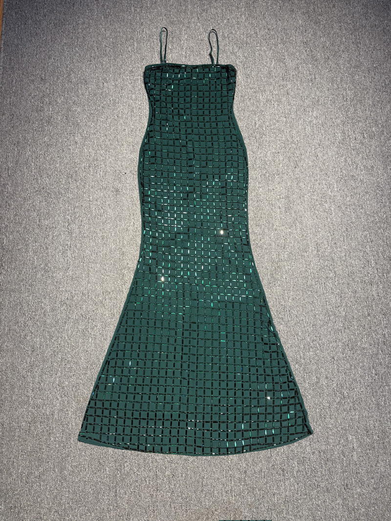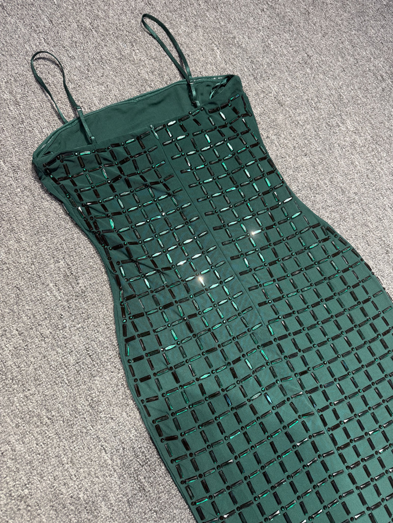 ホットガールセクシーニッチトレンディブランドラインストーンサスペンダースリムドレス黒と緑のドレス誕生日パーティー重工業ショートスカート