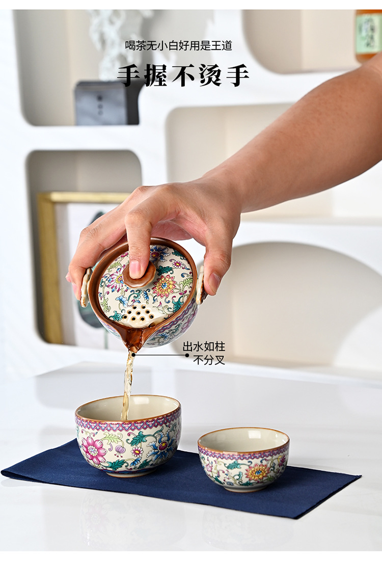 手抓壶缠枝莲便携式青花旅行茶具快客汝窑一壶三杯快客杯户外礼品
