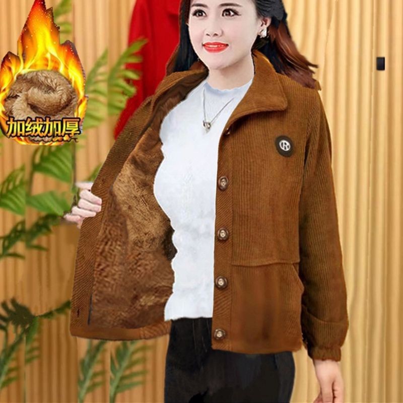 妈妈装加绒保暖灯芯绒外套女秋冬季减龄遮肚子气质厚款老年人上衣