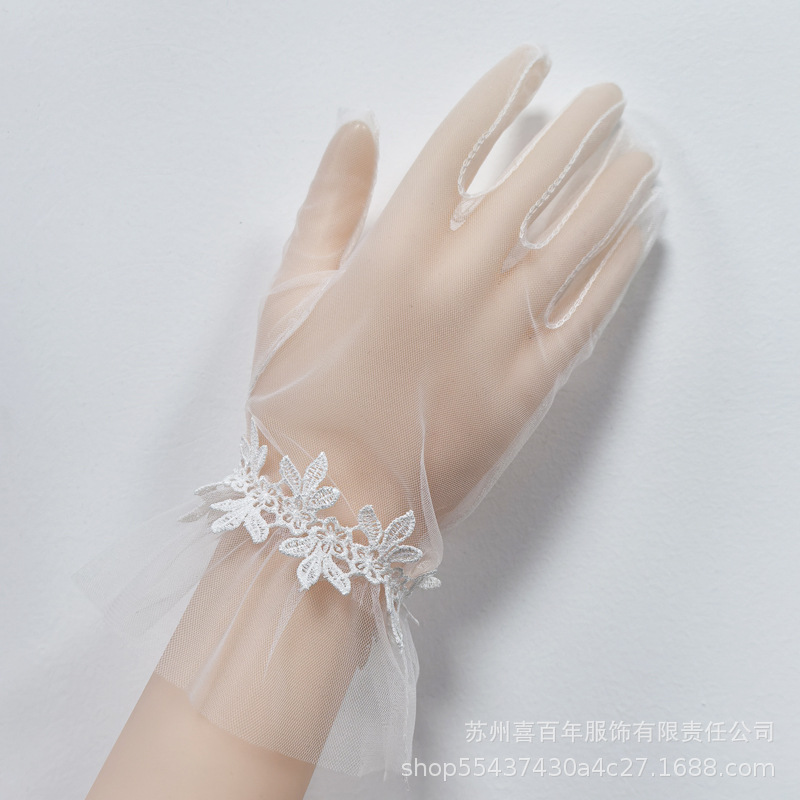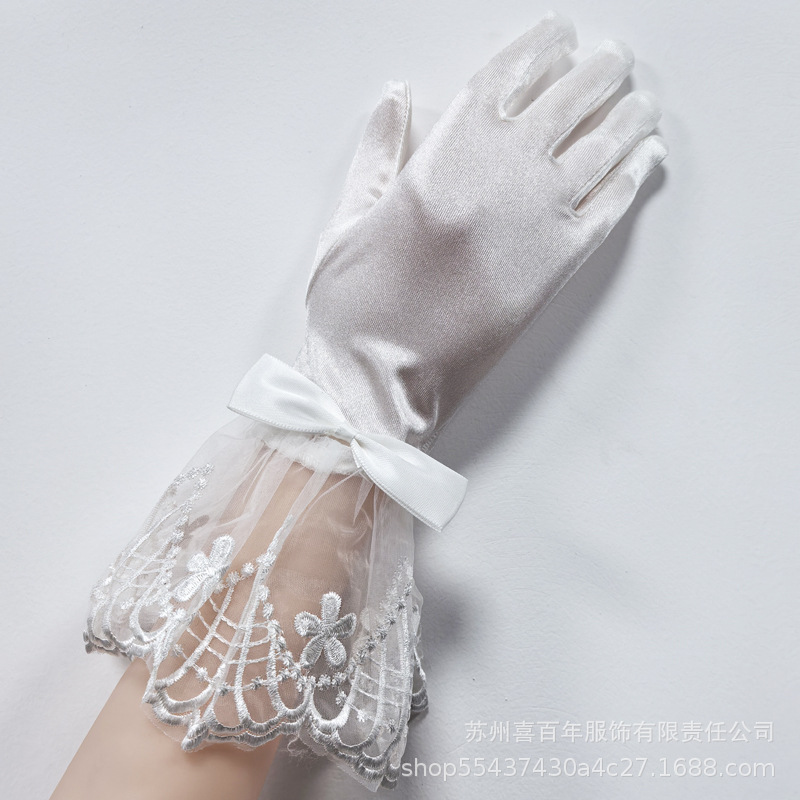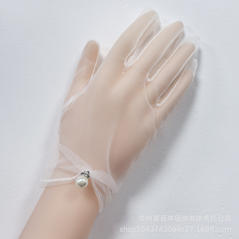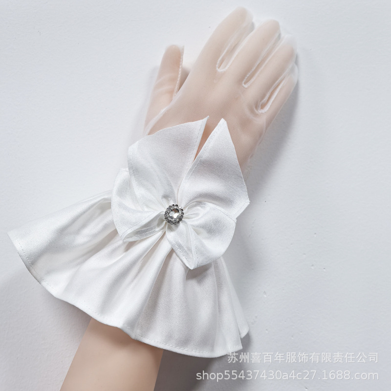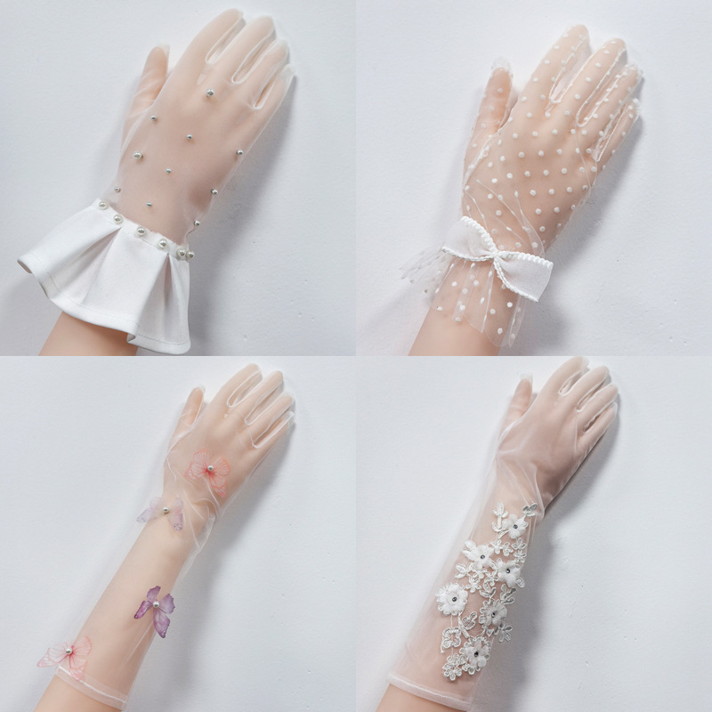 新娘白色网纱长短款蝴蝶结手套生日派对珍珠蕾丝拍照婚纱礼服手套
