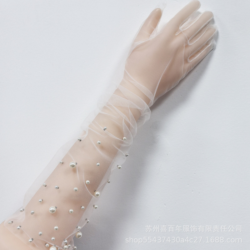 花嫁手袋白いウェディングドレス真珠ネット手袋白い糸の長い旅撮影腕を隠す夏の薄い金