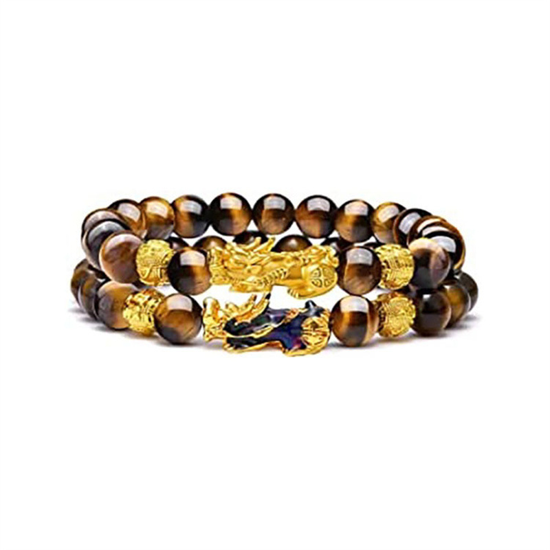黒曜石のブレスレットをまねる男女の金の生肖の竜鳳のトーテムの本命の年の手は人工水晶の宝石のカップルの装飾品を結びます。