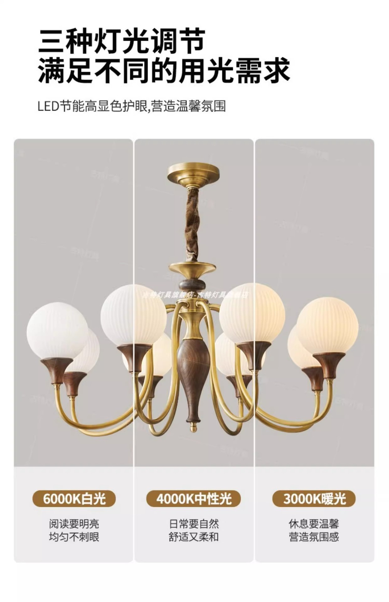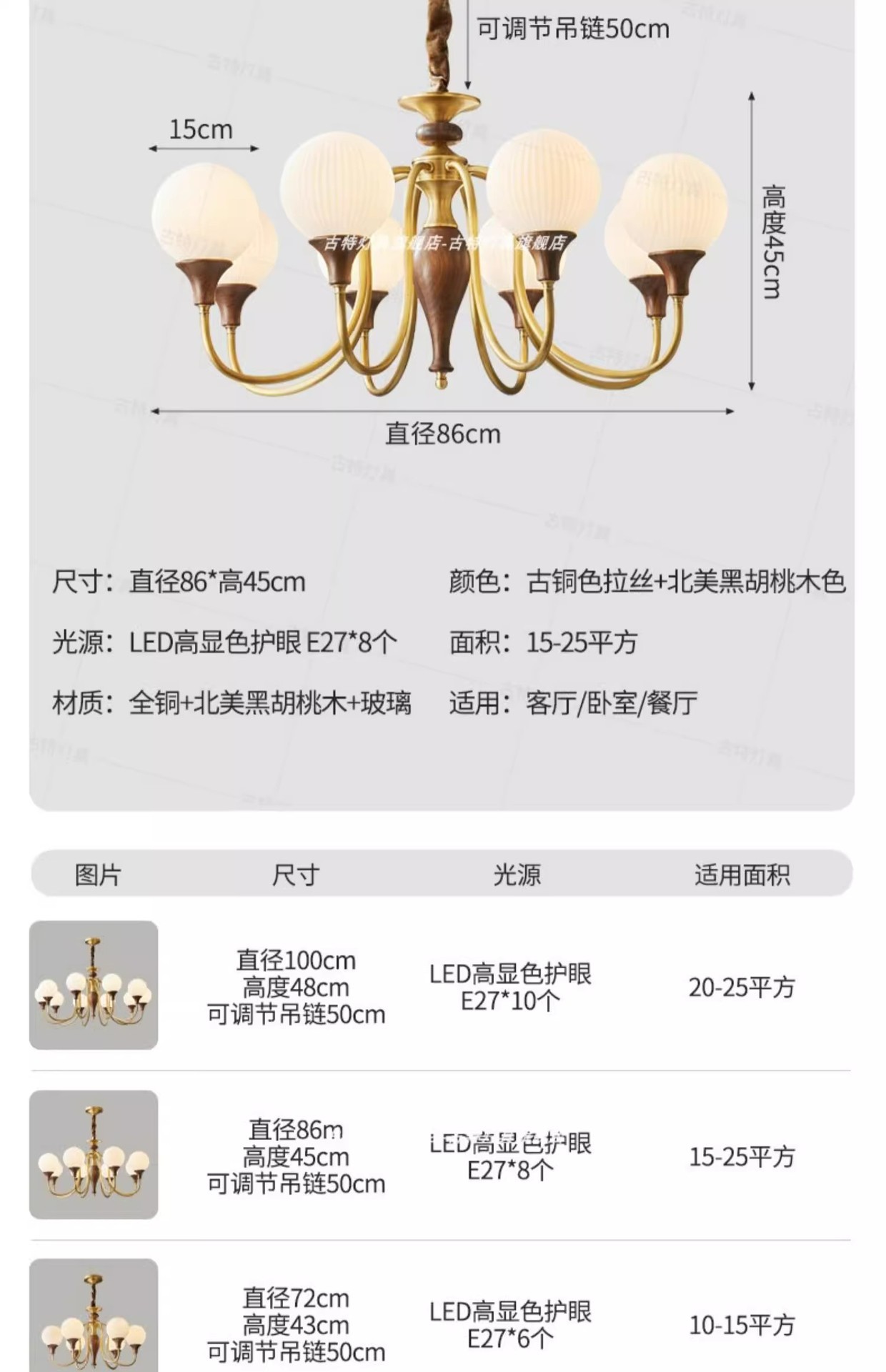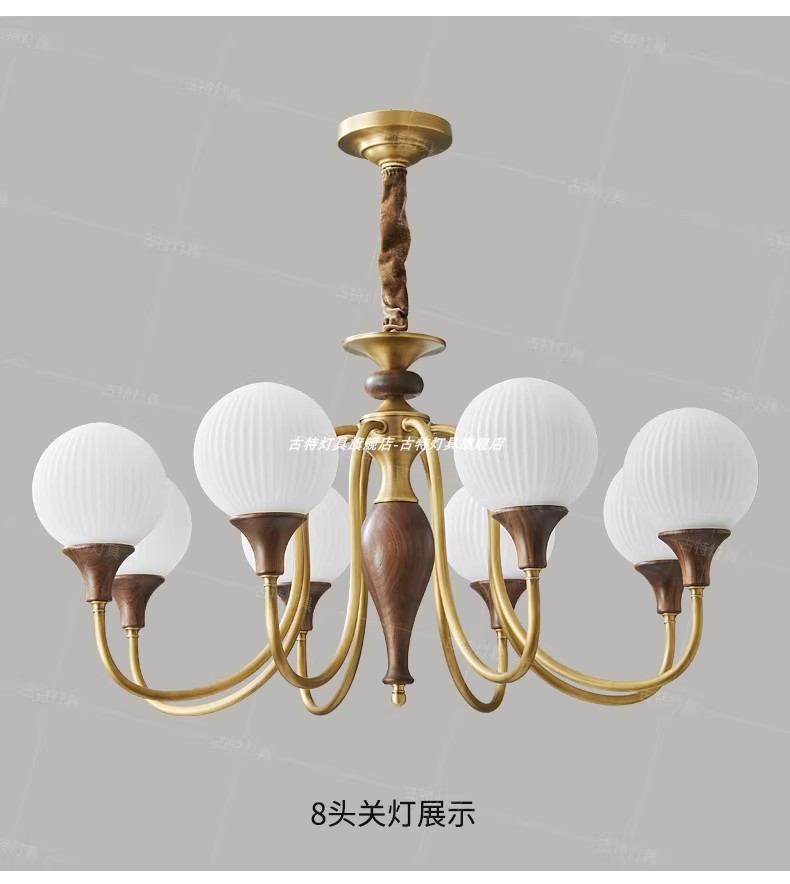 ライトの色 【全銅+北米産ブラックウォールナット丸太】6ランプヘッド直径72*高さ43CM、高CRI、目の保護、3色調光,【全銅+北米産ブラックウォールナット丸太】8ランプヘッド直径86*高さ45CM、高CRI、目の保護、3色調光,【全銅+北米産ブラックウォールナット丸太】ランプホルダー10個、直径100*高さ48CM、高CRI、目の保護、3色調光