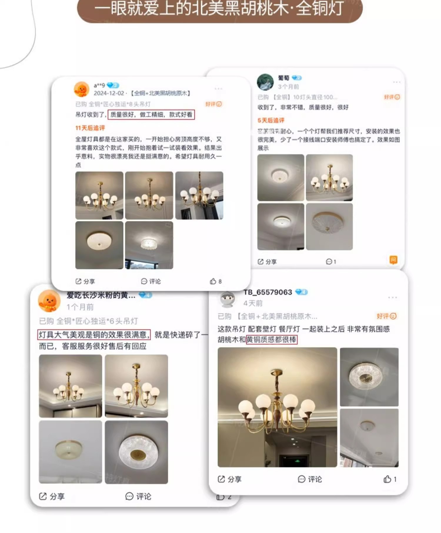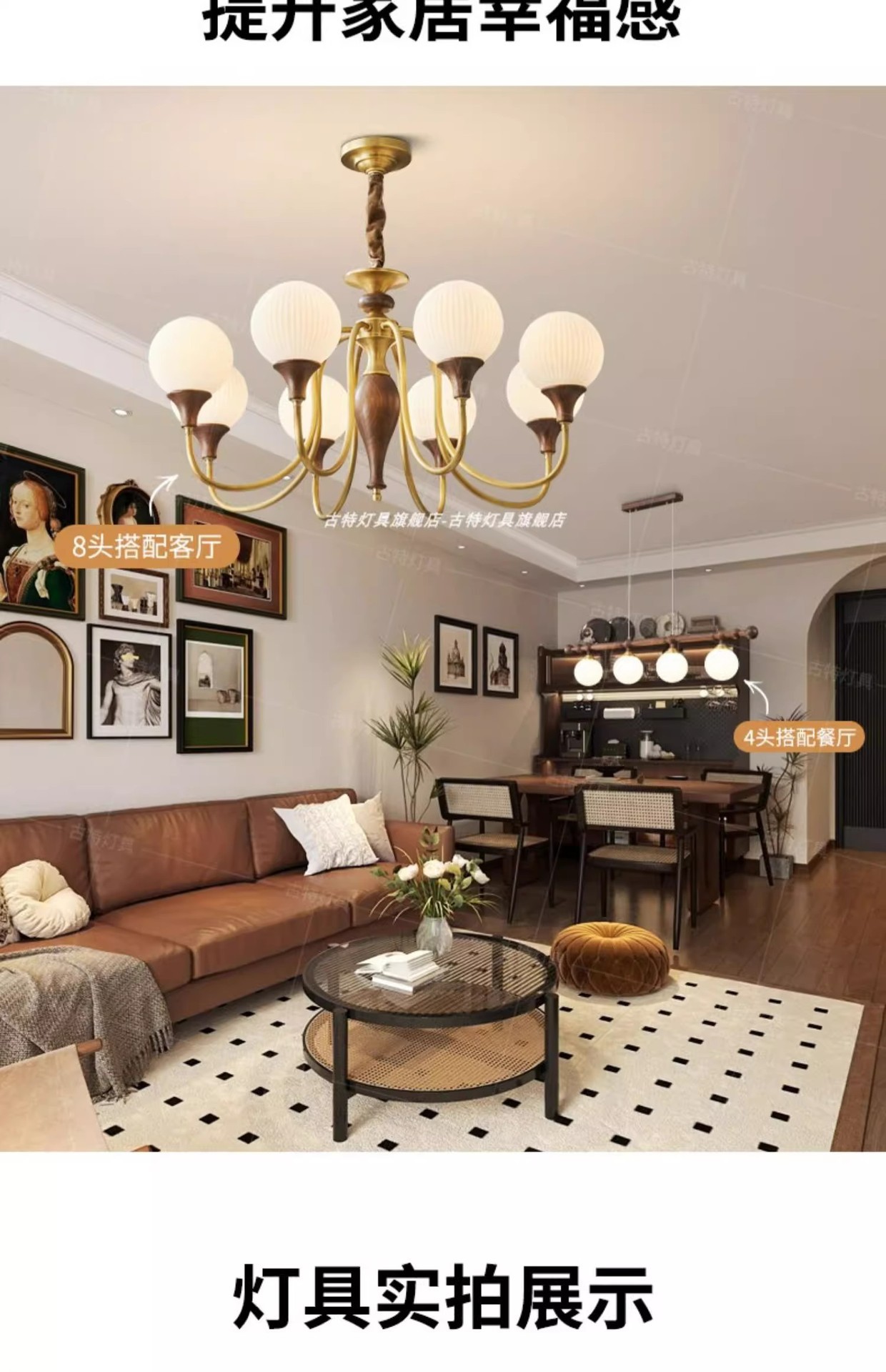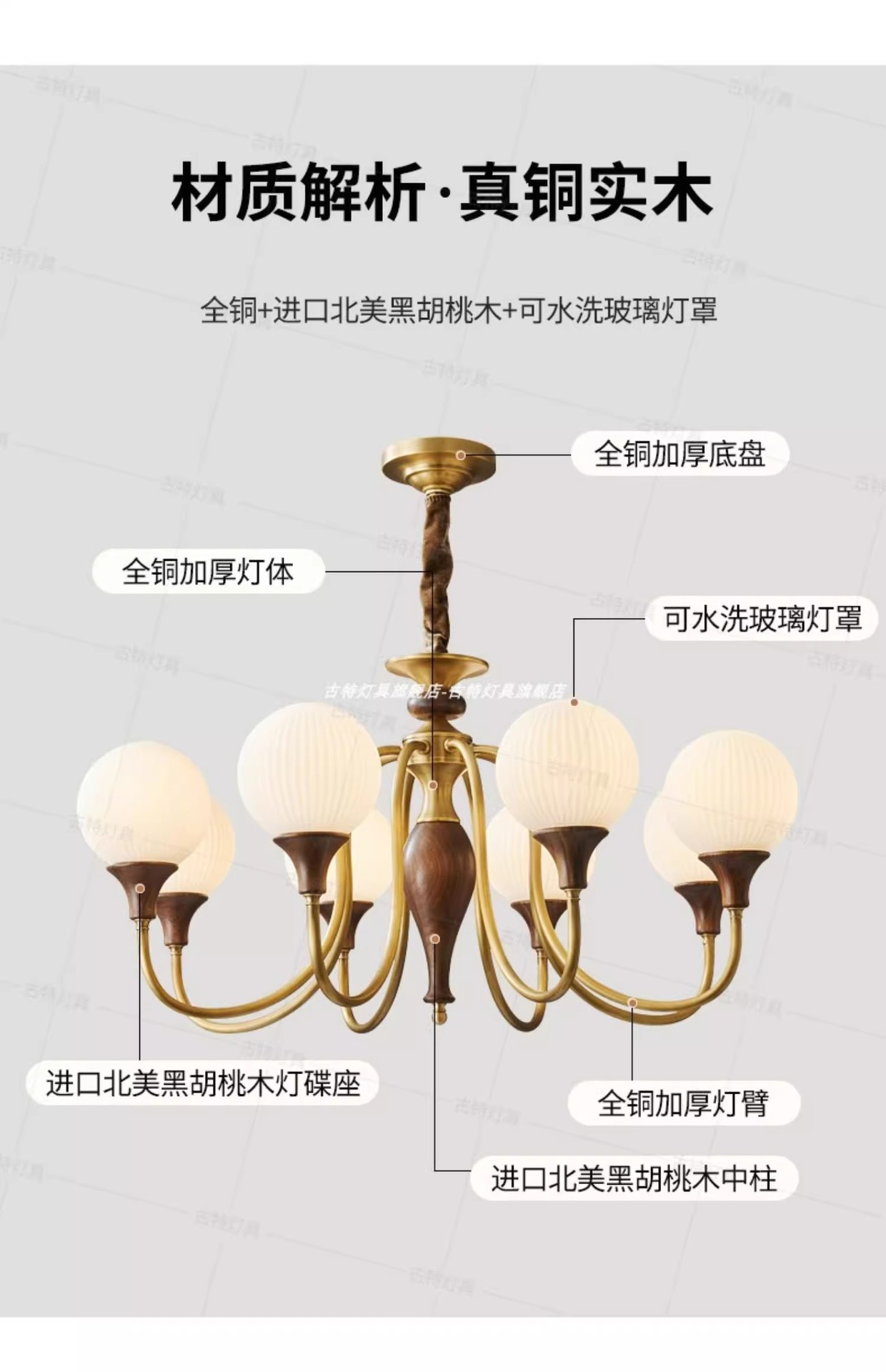 ライトの色 【全銅+北米産ブラックウォールナット丸太】6ランプヘッド直径72*高さ43CM、高CRI、目の保護、3色調光,【全銅+北米産ブラックウォールナット丸太】8ランプヘッド直径86*高さ45CM、高CRI、目の保護、3色調光,【全銅+北米産ブラックウォールナット丸太】ランプホルダー10個、直径100*高さ48CM、高CRI、目の保護、3色調光