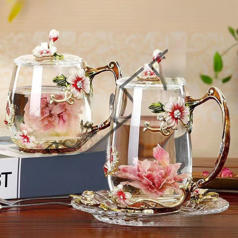 フラワーティーカップギフトコーヒーカップ朝食ミルク卸売販売エナメル女性ラウンド家庭用ガラスウォーターカップジュースカップ