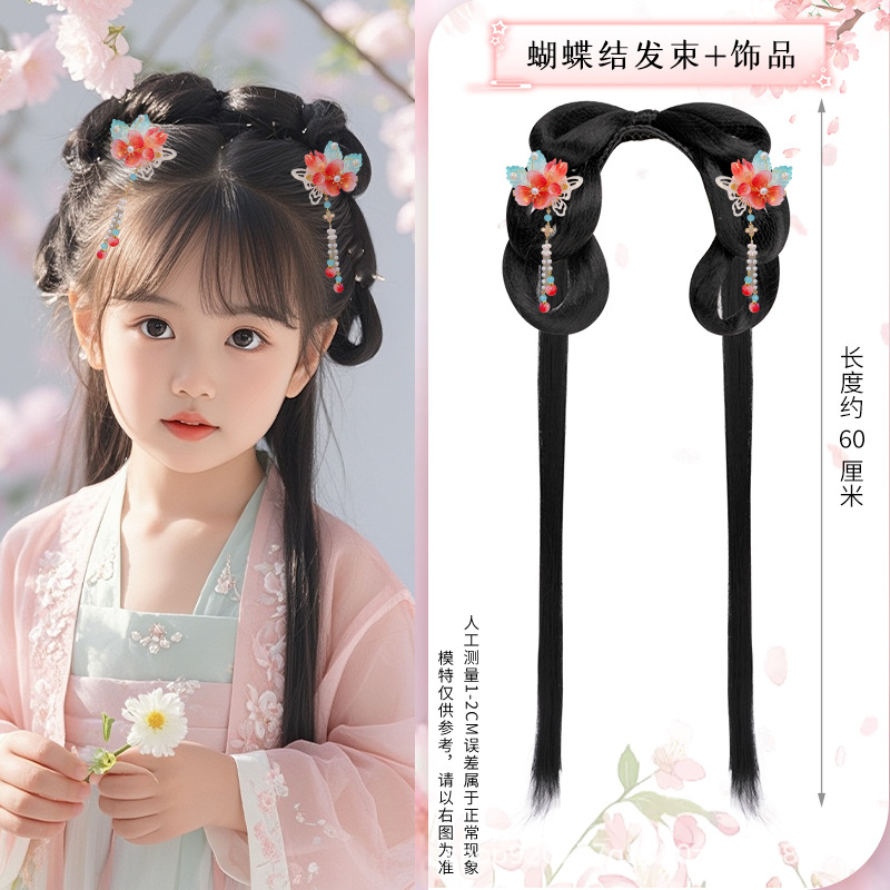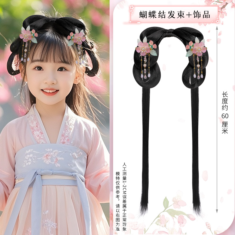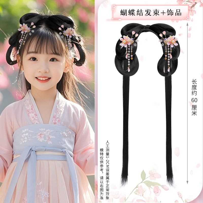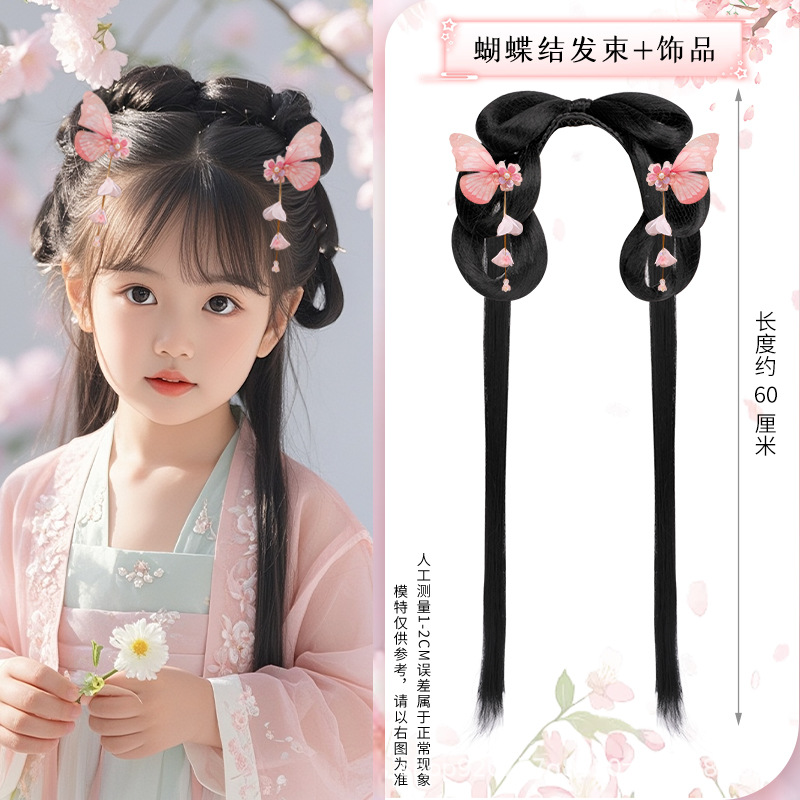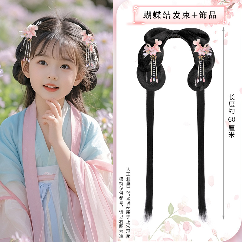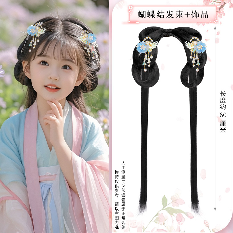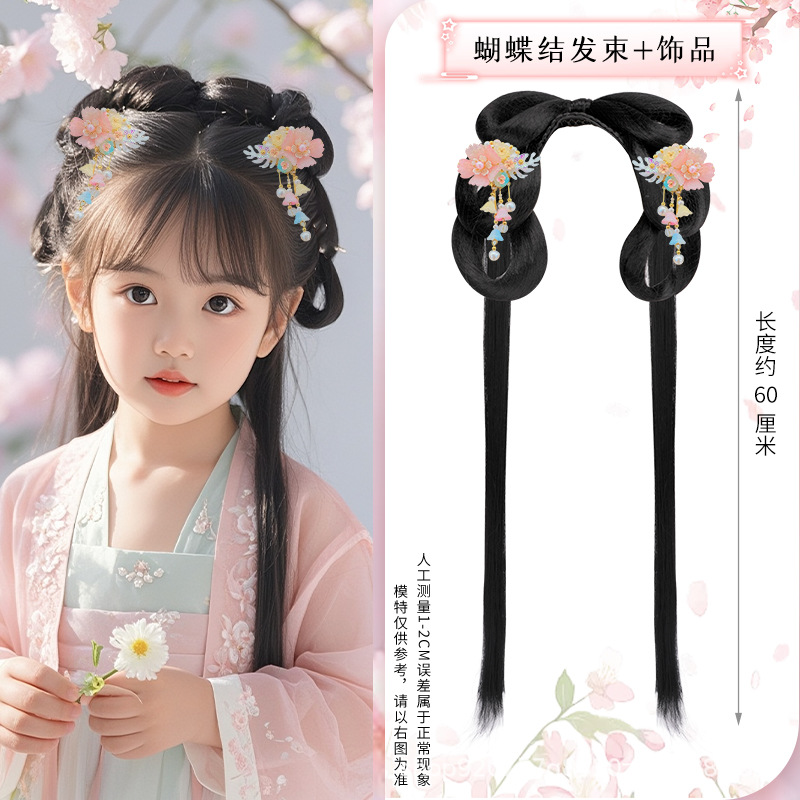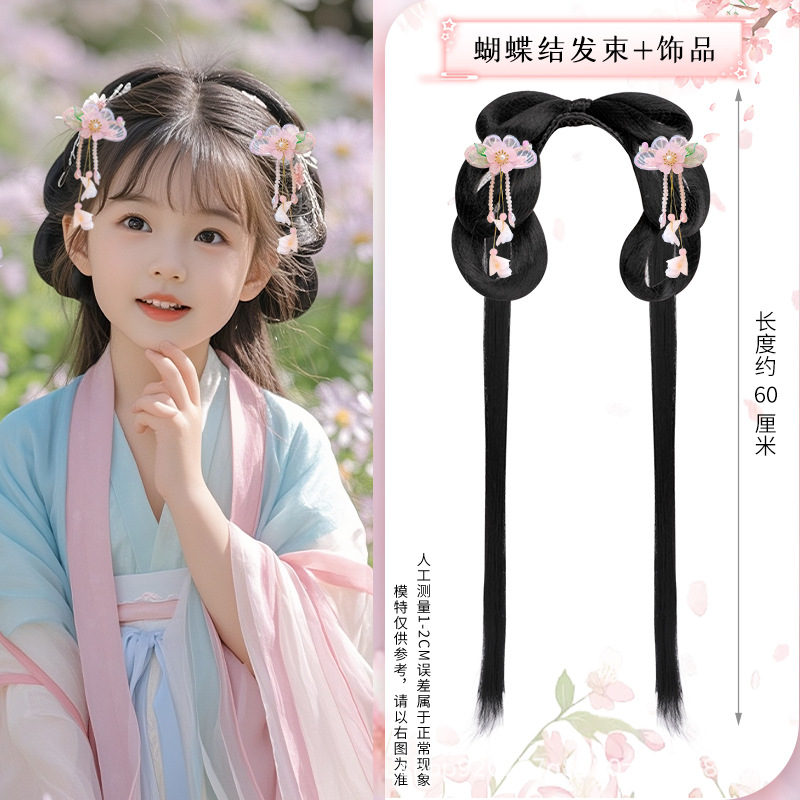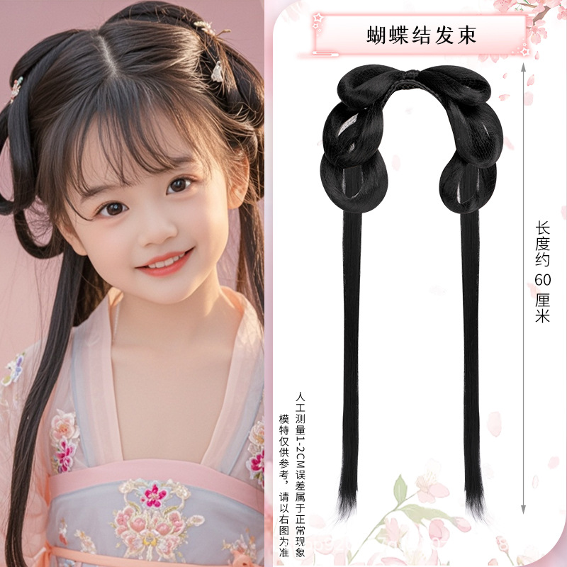 女の子の漢服ソフトヘアフープウィッグ古代衣装蝶結びヘアバンドル子供の古代スタイルのパフォーマンスヘアスタイルかわいいヘアアクセサリー