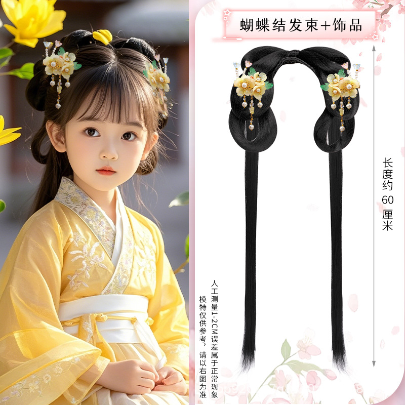 古代風の子供用空飛ぶおだんごヘアステージパフォーマンス女の子用オールインワンヘアウィッグ、さまざまなかわいくて多用途なヘアアクセサリー