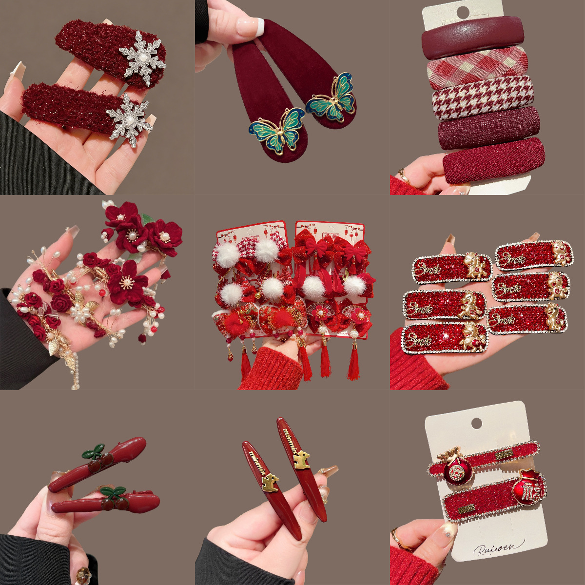 新年ヘアアクセサリー、赤いヘアピン、高級感のある絶妙な前髪サイドクリップ、蝶結び、女の子用植毛サイドクリップ