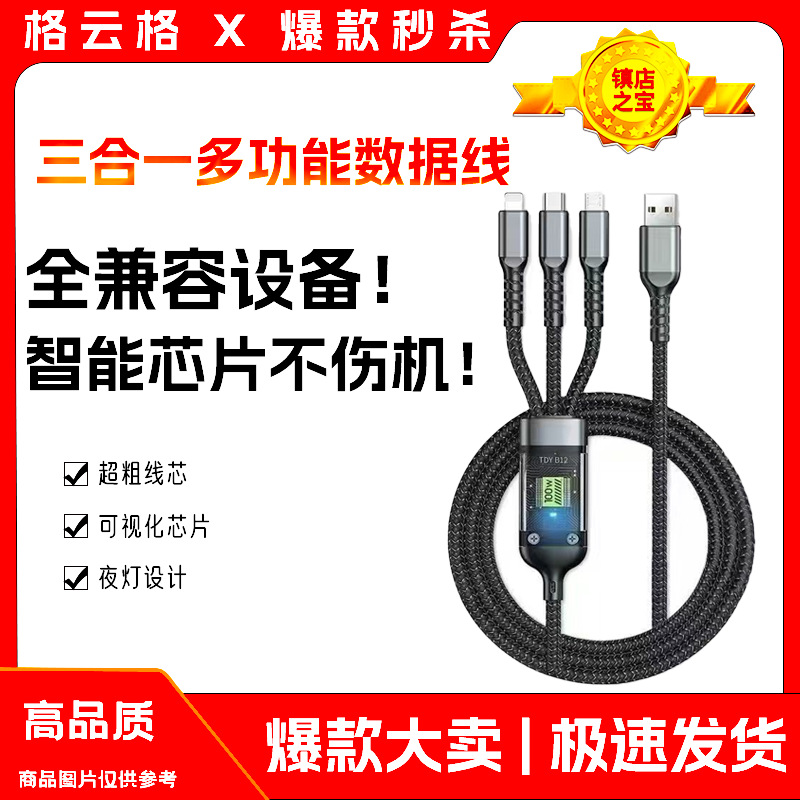 格雲格 100Wデータケーブル 透明中型カード発光型3in1データケーブル 急速充電編組ケーブル 1対3データ転送