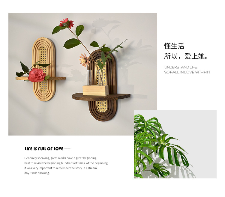 無垢材色、ブラックウォールナット色、2色の組み合わせ、無垢材チップ花瓶、アーチ二重管壁掛け花瓶