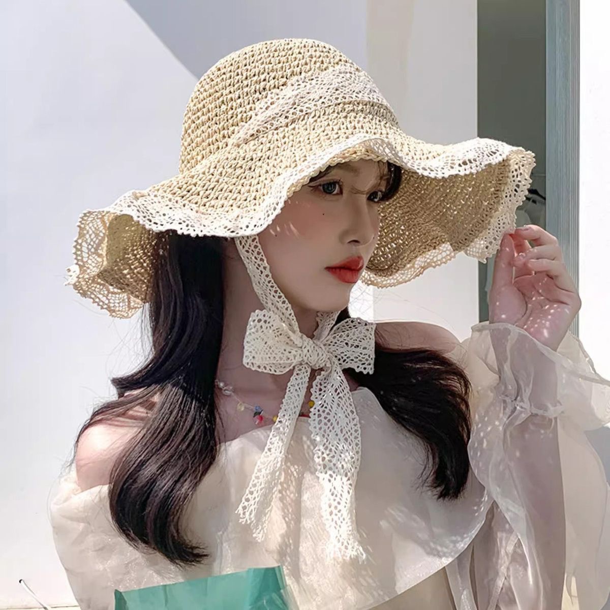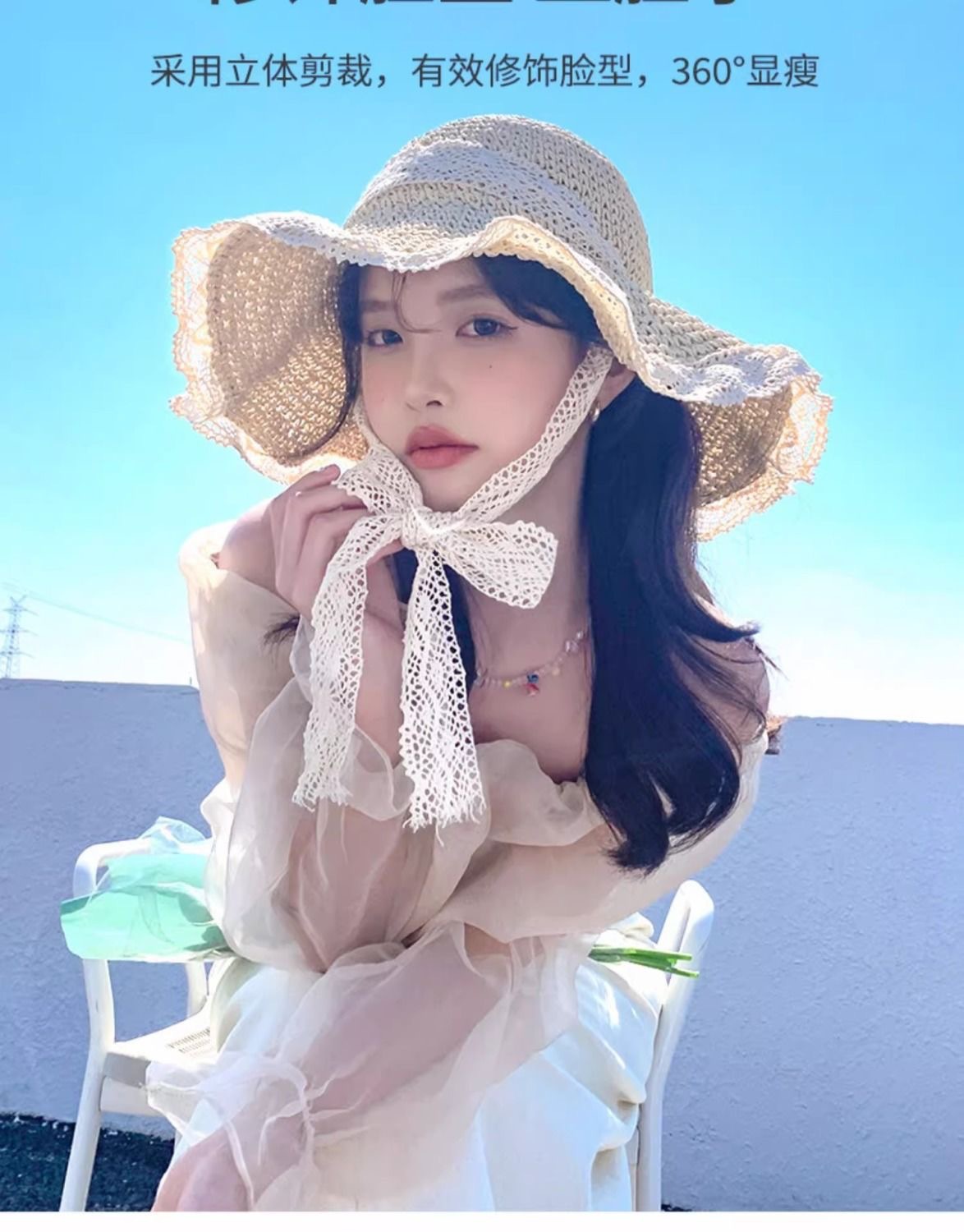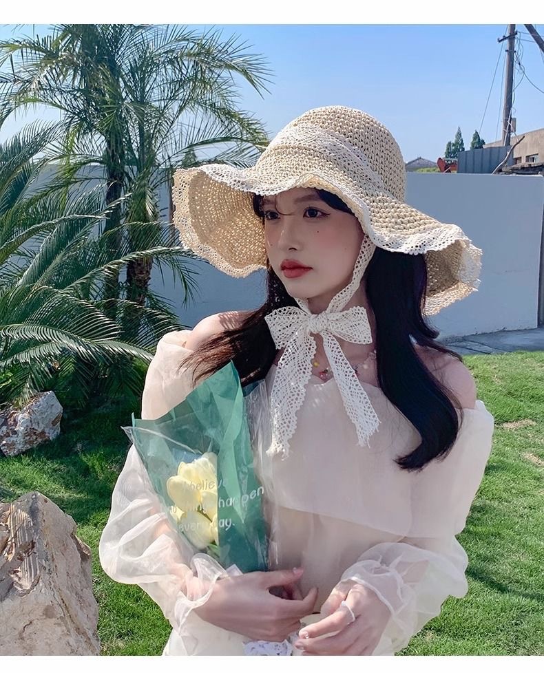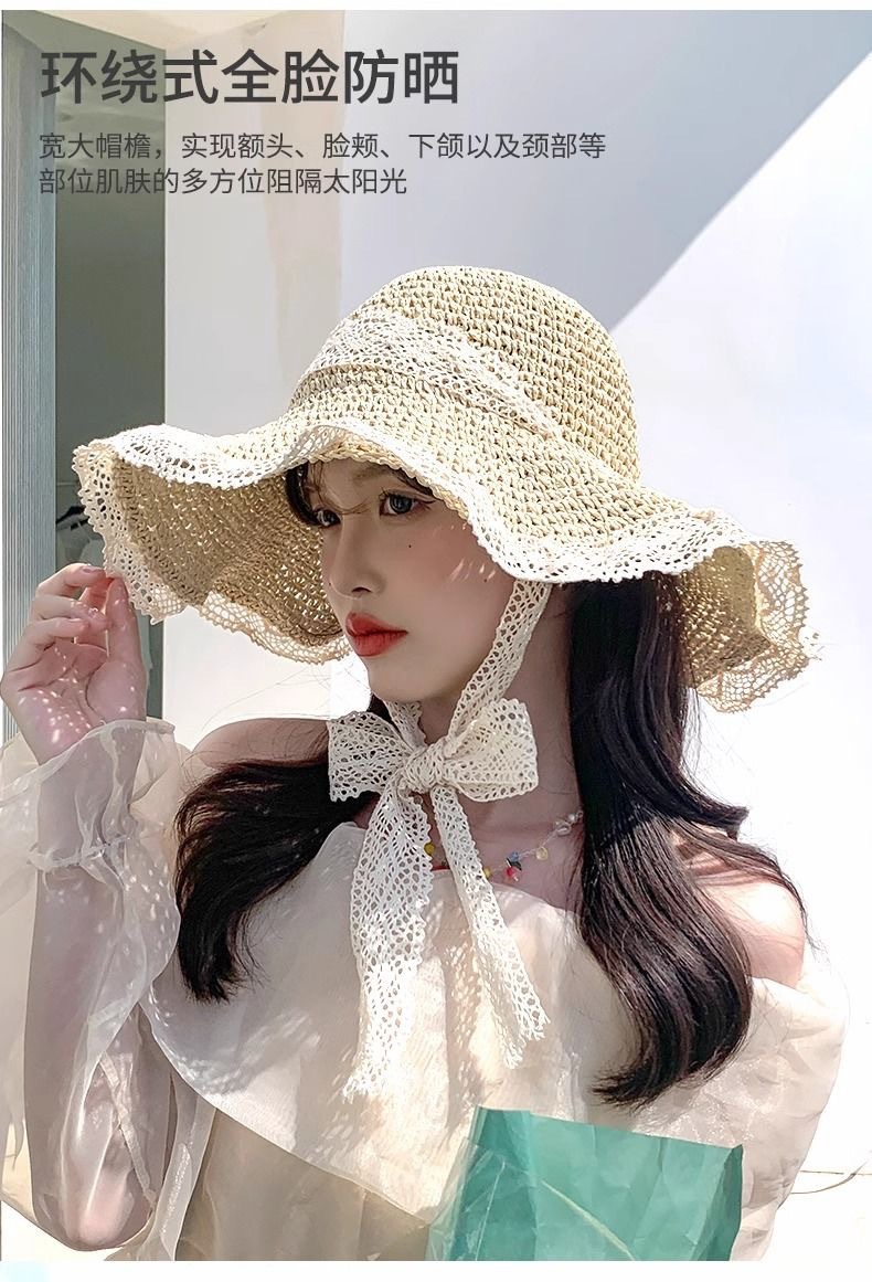 ビーチリゾートスタイルの帽子、インターネットセレブの帽子、麦わら帽子、レースのつばの大きな帽子、顔全体を覆う日焼け止め帽子