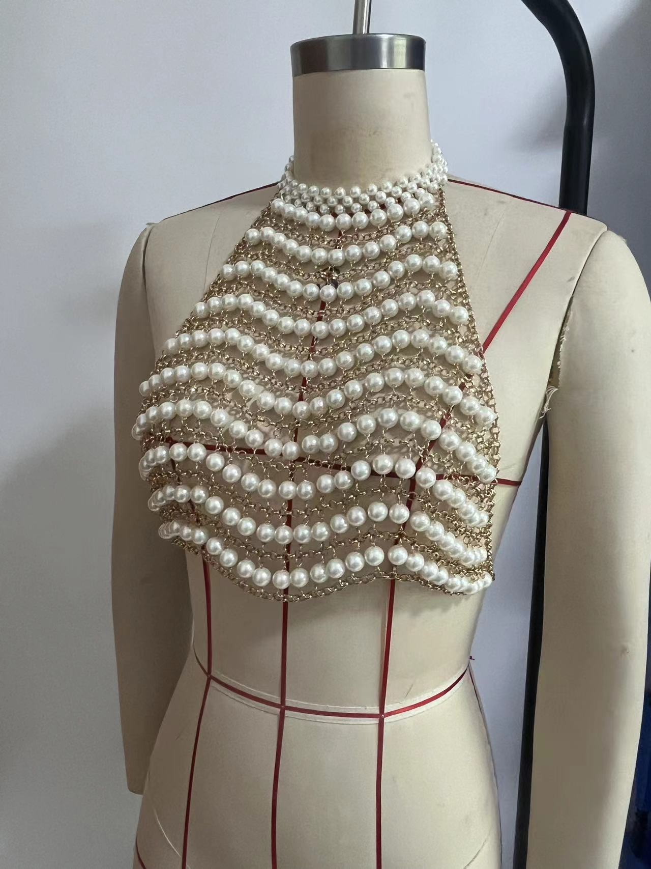 L6675Y ハンドメイドビーチブラジャーパールボディチェーンブラジャーフェスティバル衣装透明ダイヤモンドチェーントップ