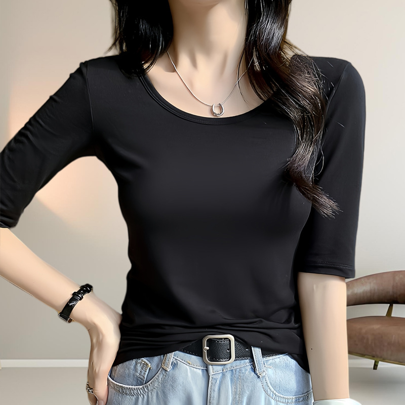 ブラックモーダルミッドスリーブTシャツレディース半袖春夏薄手ローネックスリムフィット五分袖ボトムインナートップ