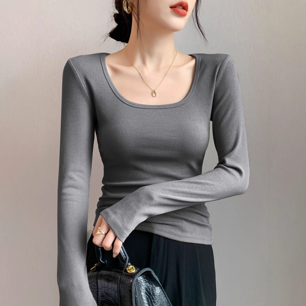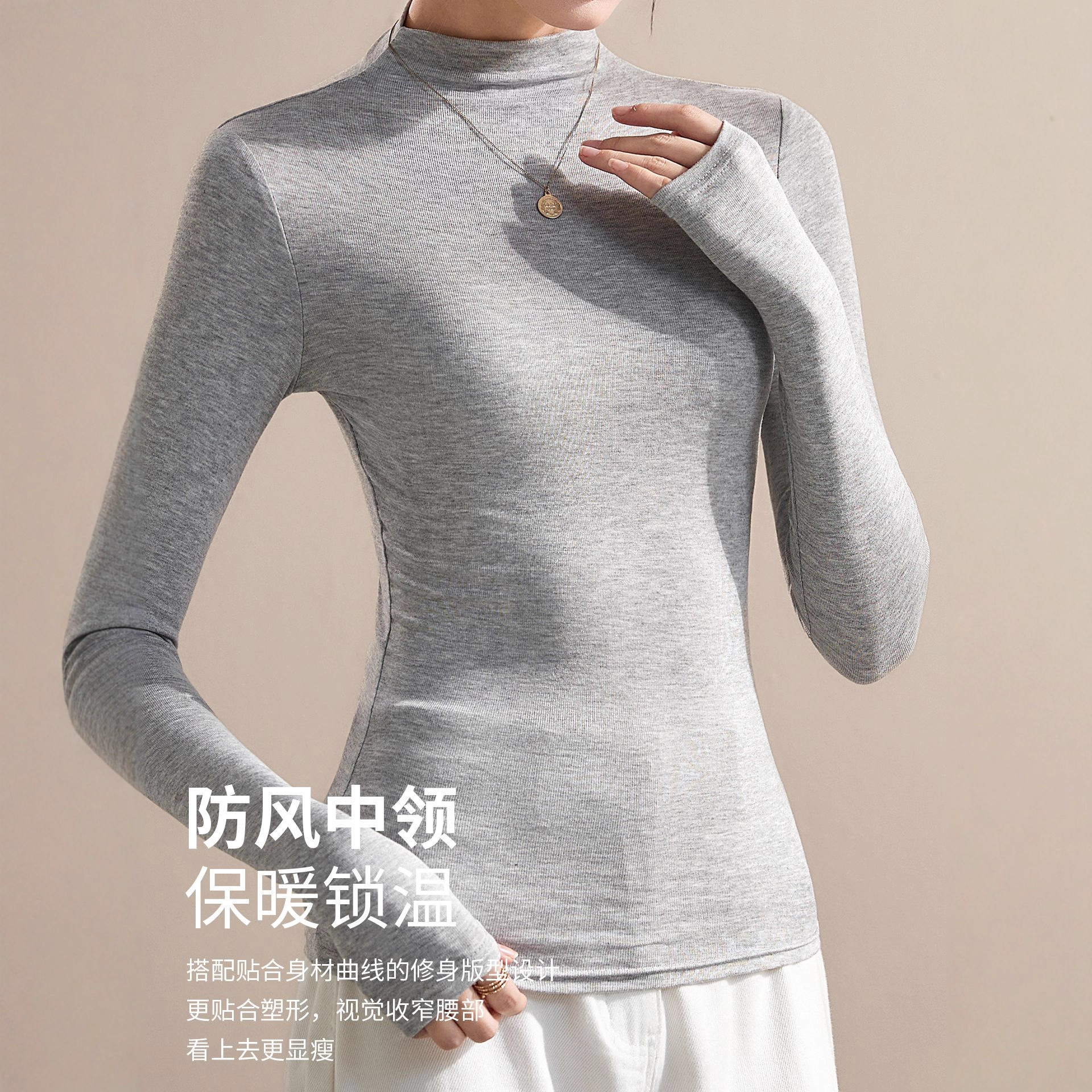灰色长袖打底衫女2026新款秋季内搭修身显瘦早秋防风中领t恤上衣