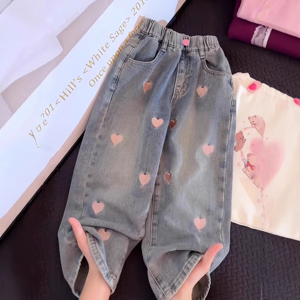女の子ジーンズ春と秋の新作2025中大型子供ストレートパンツ新しいネットセレブガールタオル刺繍ワイドレッグパンツ