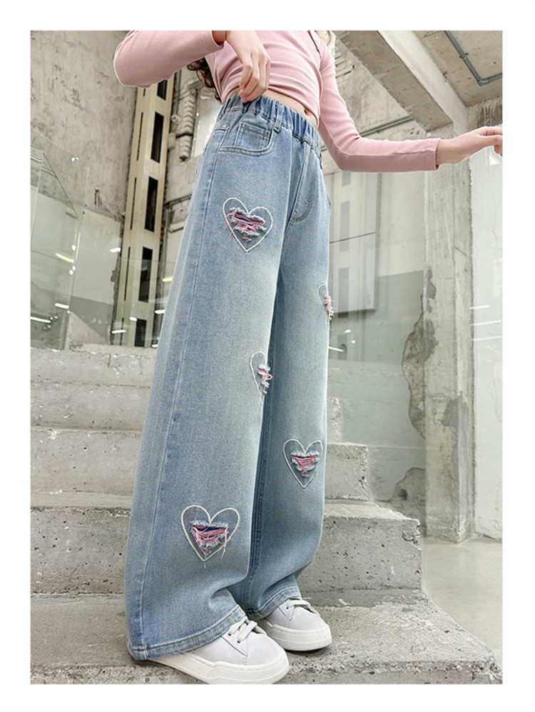 春と秋の新しい女の子デニムストレートパンツワイドレッグパンツルーズ中型と大型子供用ズボン甘いカジュアルファッション