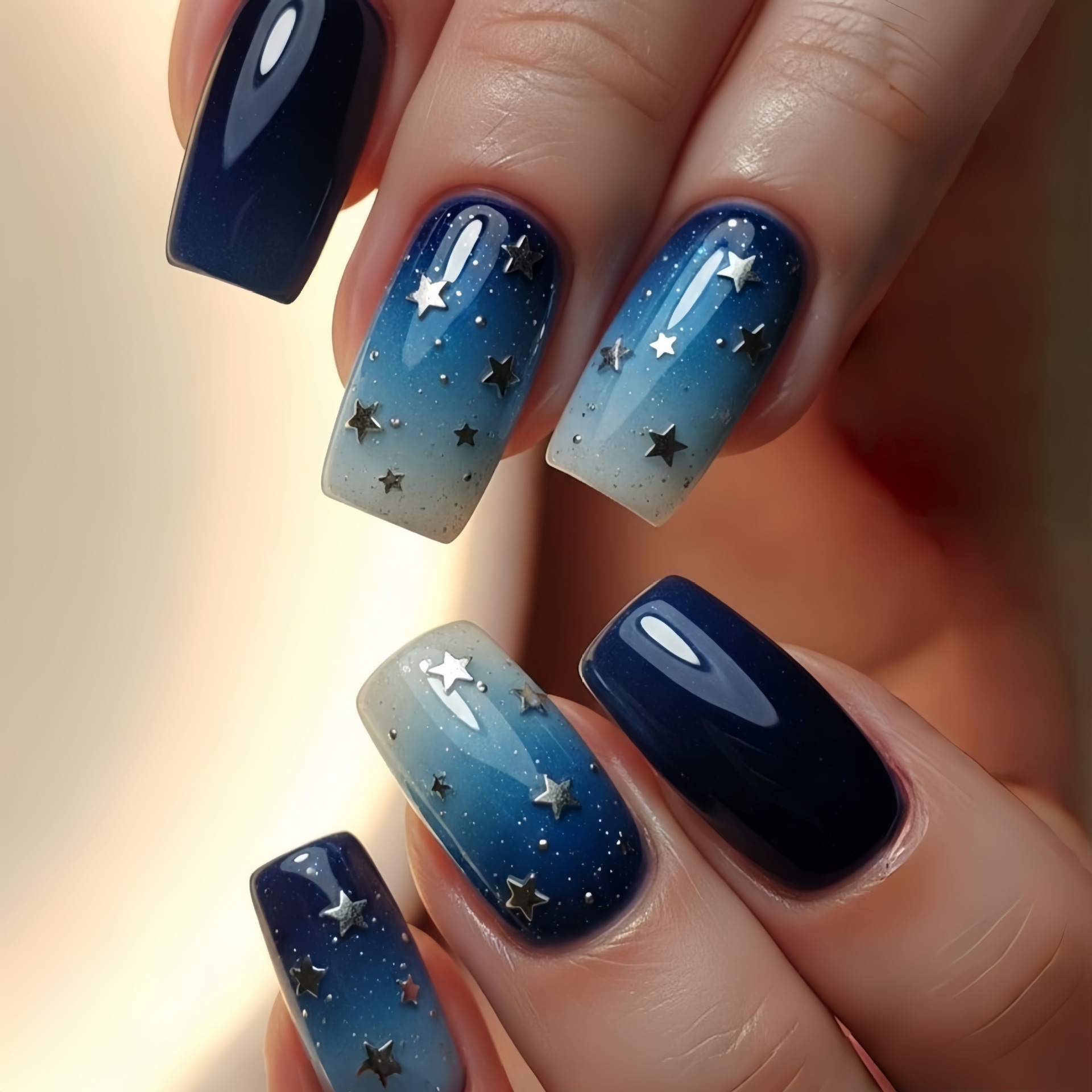 蓝色星星中长款欧方形美甲贴片 欧美时尚美甲贴片可拆卸穿戴甲