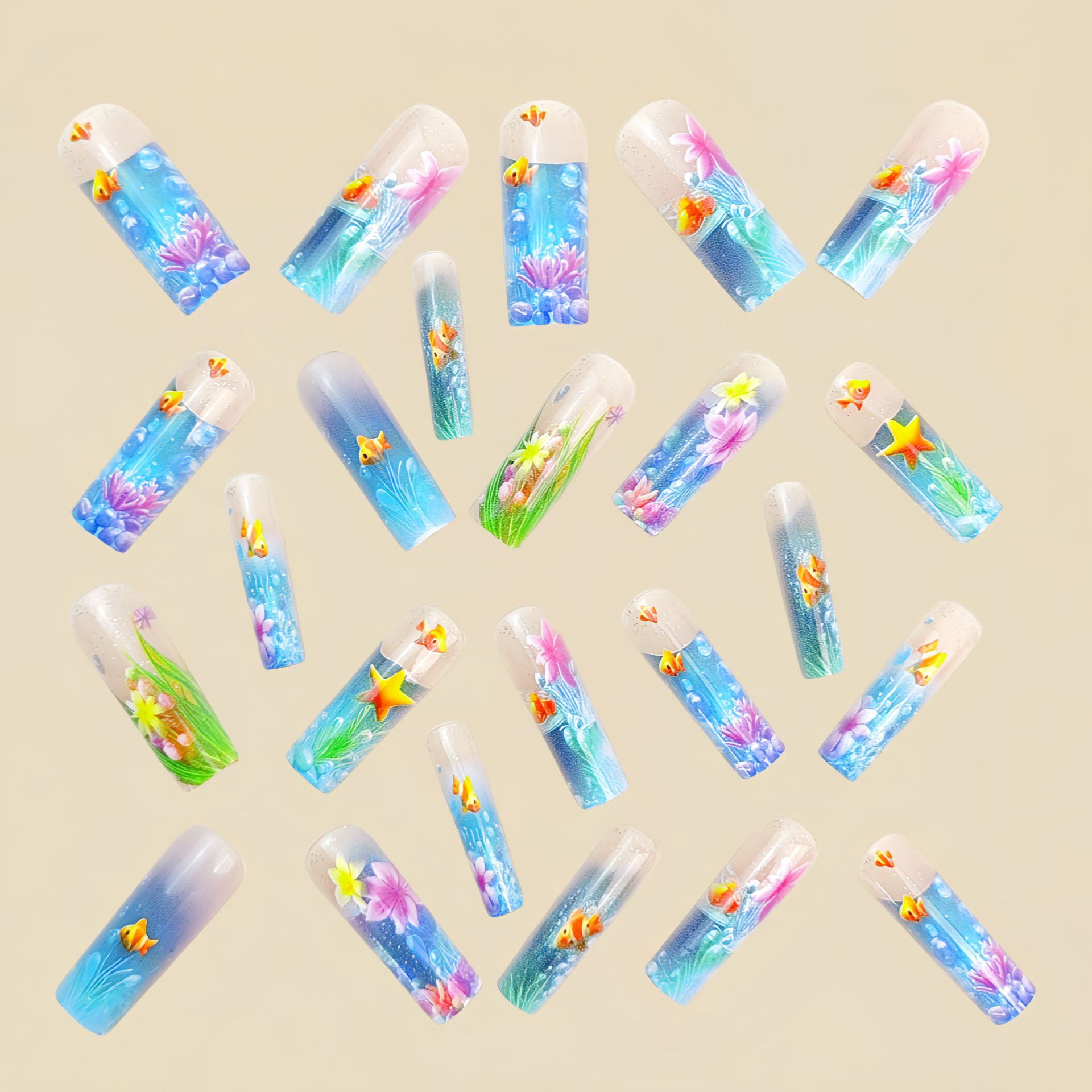 ロングタイプのヨーロッパの四角いネイルシールの青い海洋スタイルの氷透感の小さい醜い魚の図案の偽の爪のシールのヨーロッパ