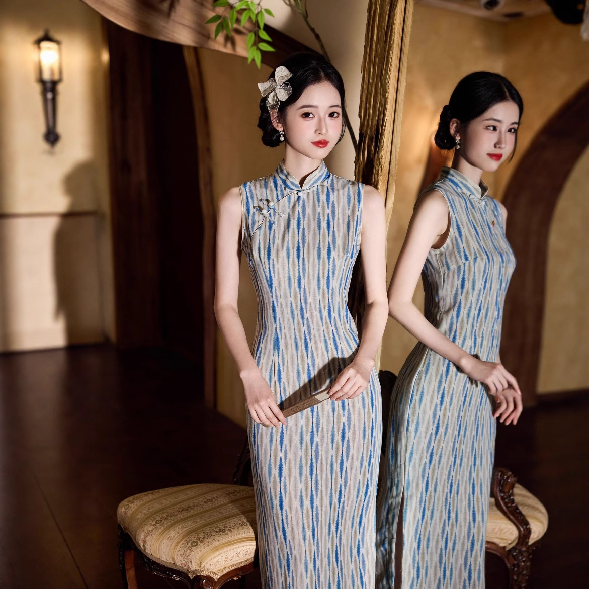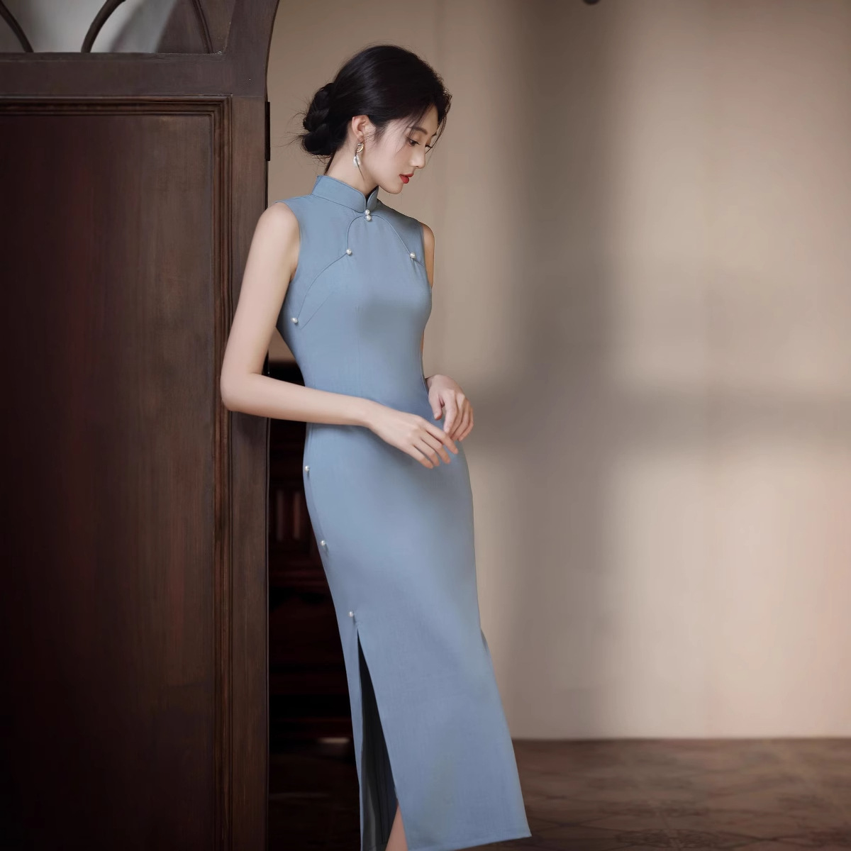 2025 新しい夏のチャイナドレスブルー高貴な気質エレガントなチャイナドレススタンドカラーノースリーブスリムフィットキャットウォークチャイナドレス
