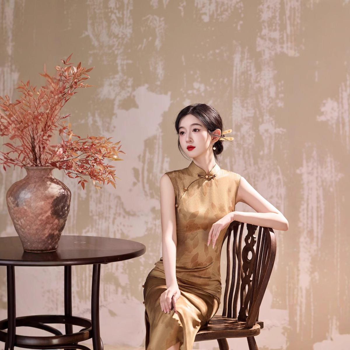 2025 新しい夏のチャイナドレスゴールデンプリント模造アセテート生地チャイナドレスノースリーブウエスト痩身女性のチャイナドレス在庫あり
