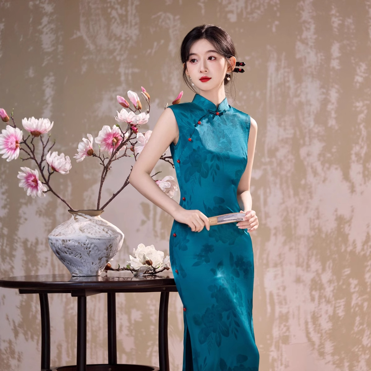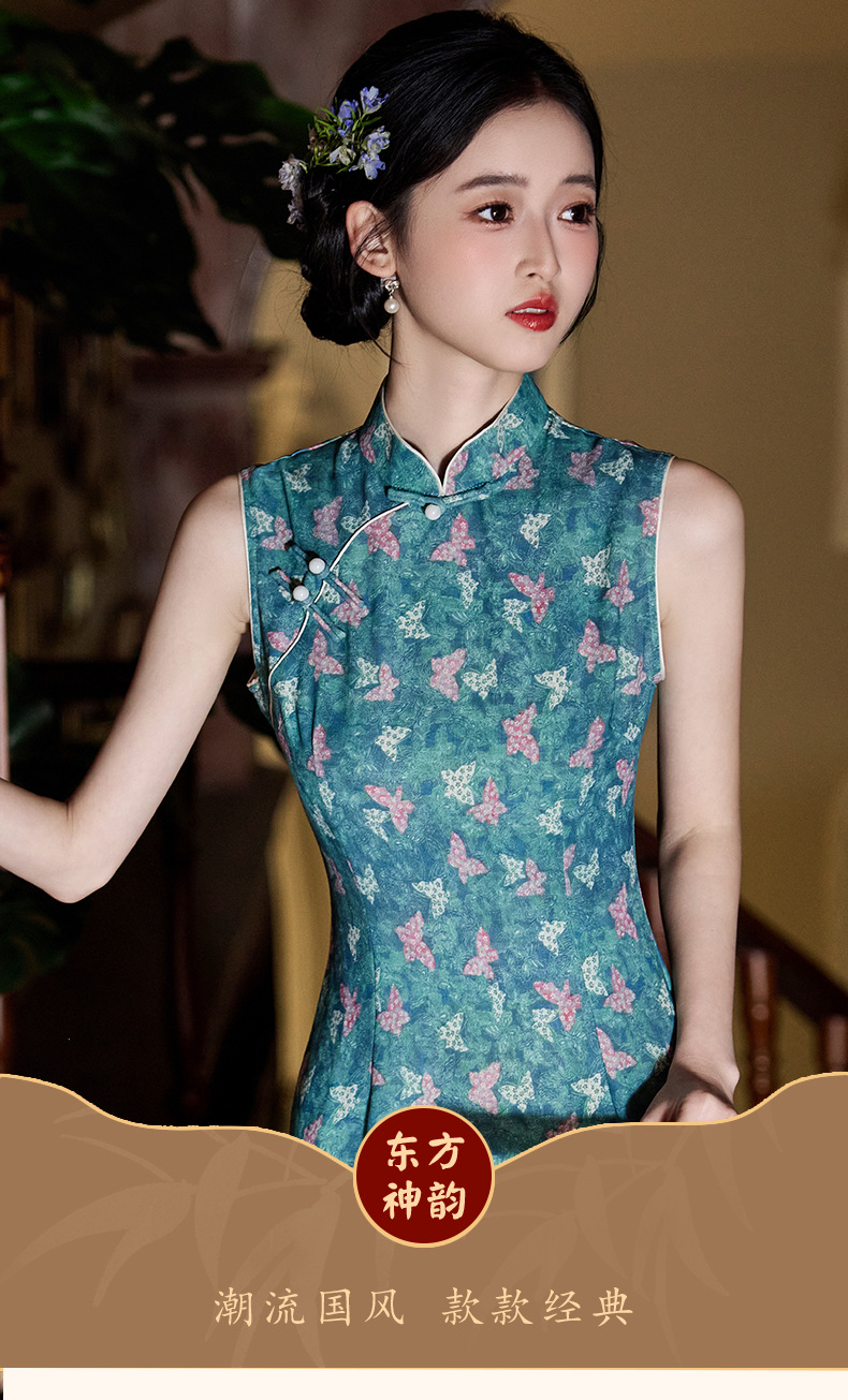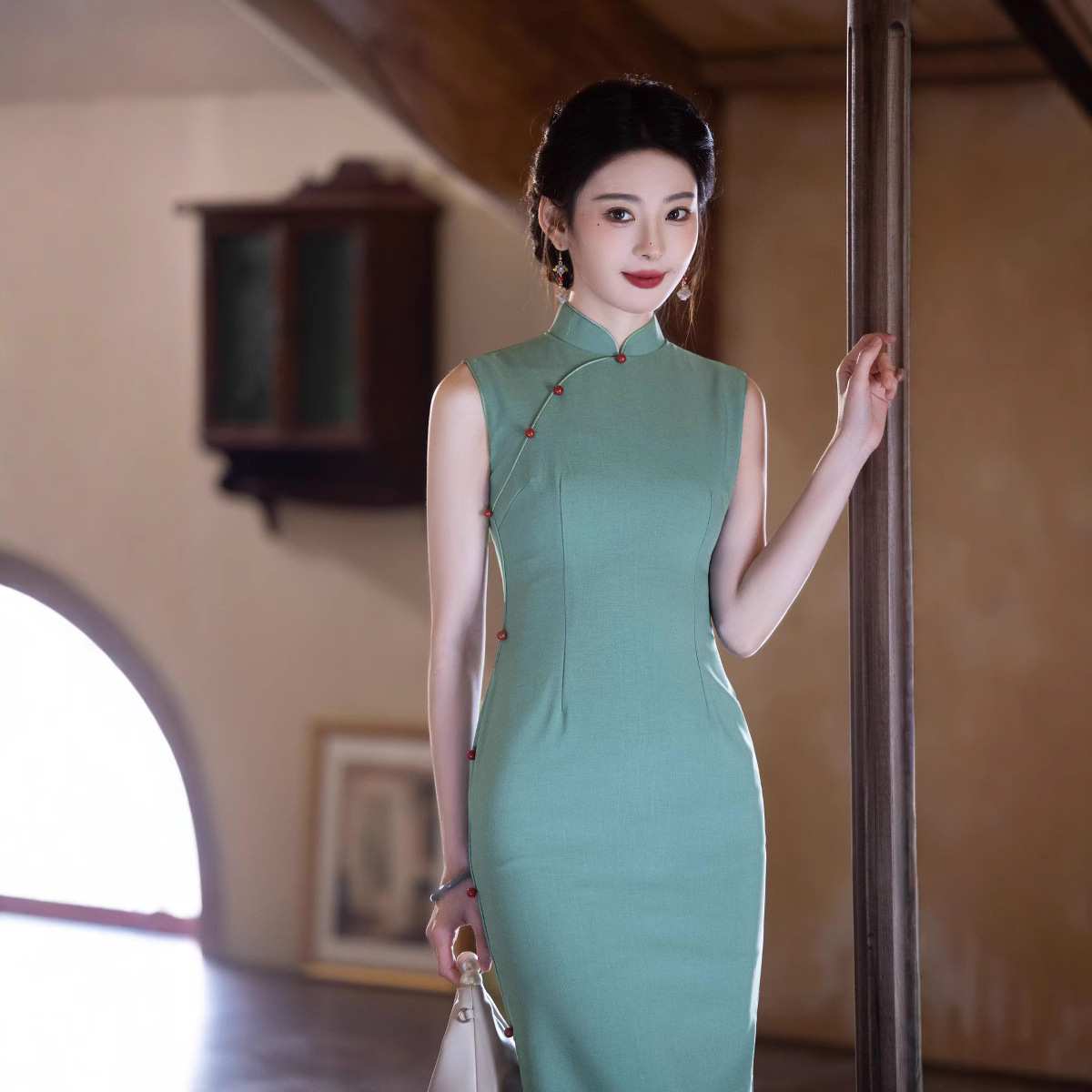 2025春夏新作チャイナドレス若手グリーンスリムノースリーブチャイナドレス新中国式高級気質優雅チャイナドレス