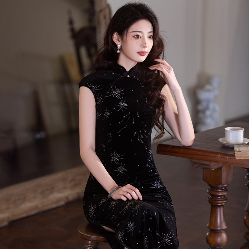 2025春夏新作チャイナドレス韓国絨毯新中国風復古民国風黒チャイナドレス改良修身長チャイナドレス