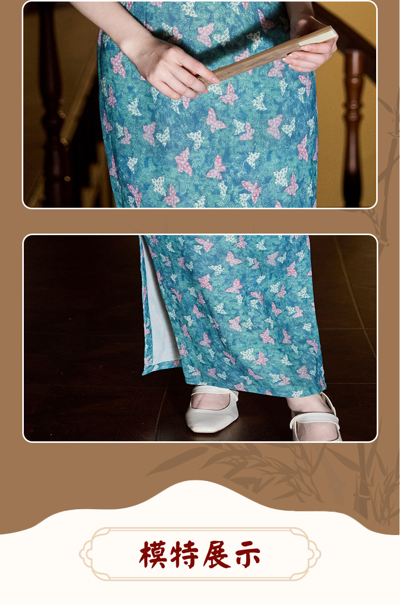 2025春夏の新型チャイナドレスの天糸生地の二重の青いプリントの袖なしの長いタイプのチャイナドレスはスリムに見えます。