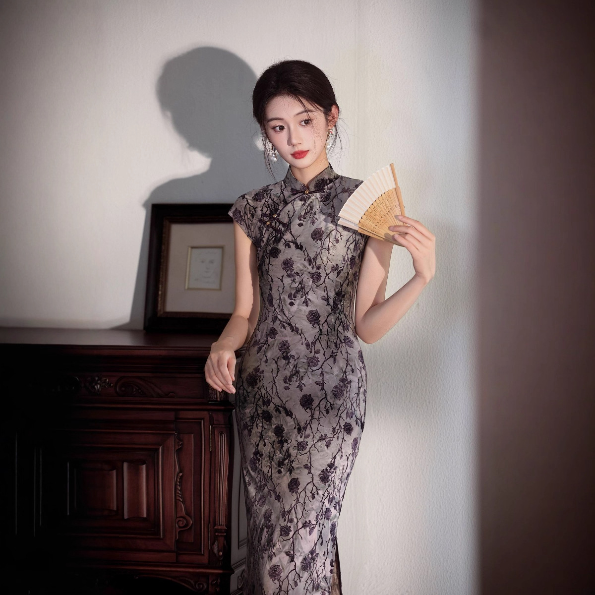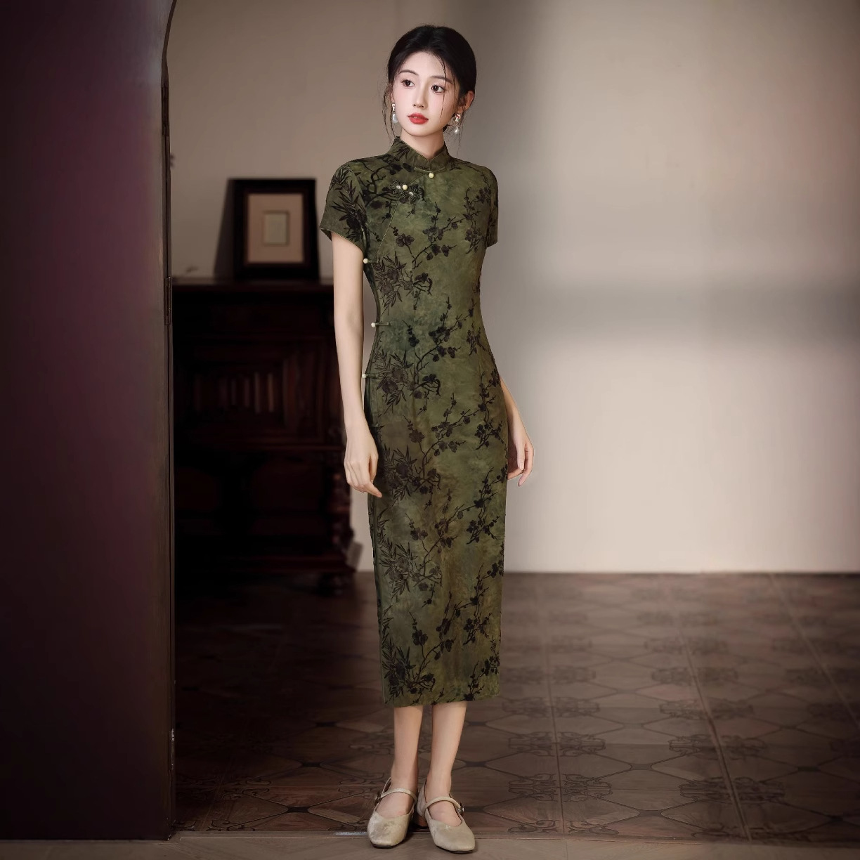 2025年新作夏のチャイナドレス植毛生地、新中国風の半袖ロースリットチャイナドレス、スリムで美しいチャイナドレス