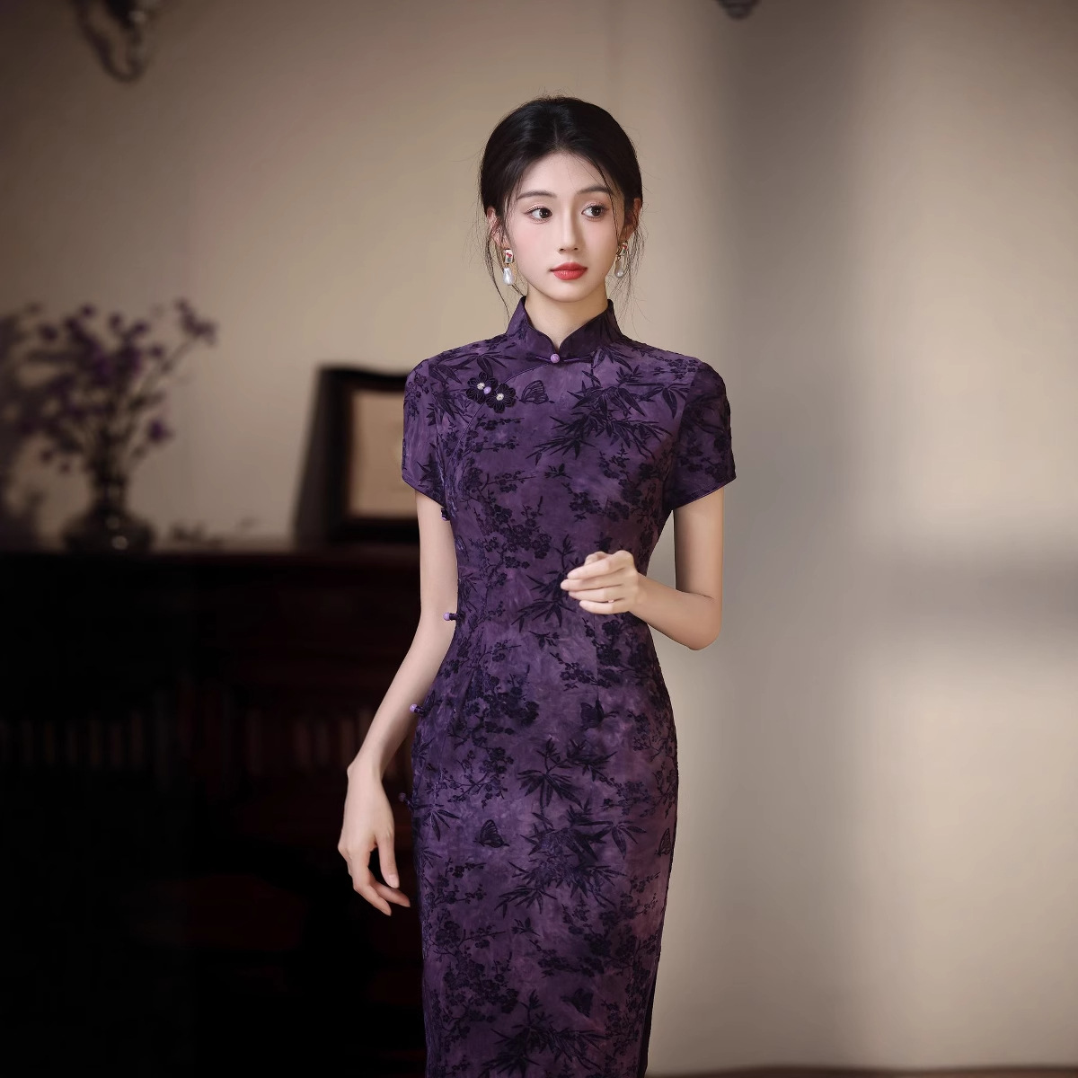 2025春夏新作チャイナドレス新中国風半袖紫チャイナドレス若年モデル改良版ワンピース現物