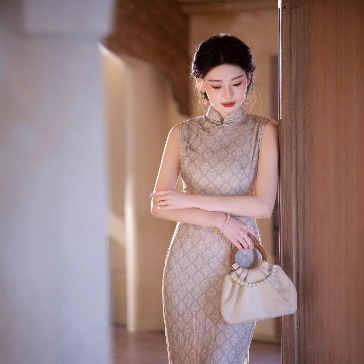 2025 新しい夏のチャイナドレスノースリーブ植毛ジャカードチャイナドレス新中国風スリムウエストサイド 8 ボタンチャイナドレス在庫あり