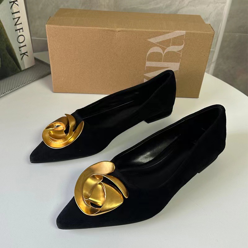 ZA2025秋季黑色金属花朵饰羊反绒高跟单鞋方头粗跟休闲女超高跟
