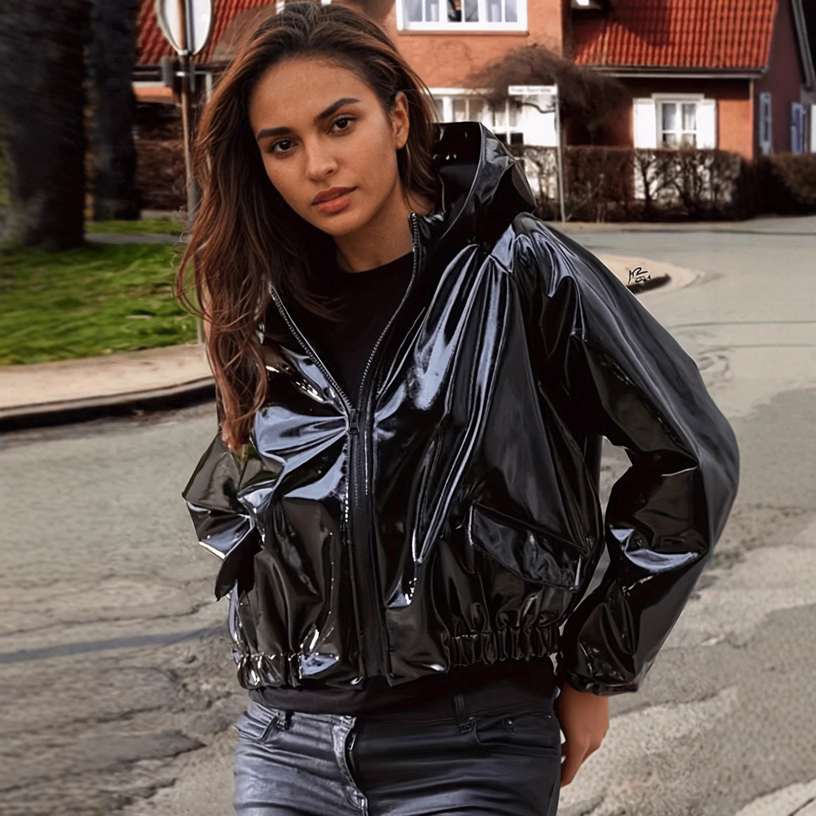 跨境外贸pu连帽外套欧美亚马逊女装镜面皮革时尚夜店短款飞行夹克