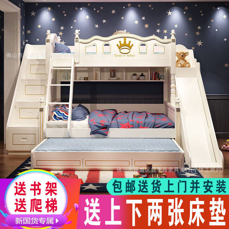 美式高低床双层床上下床滑梯衣柜实木柱男孩女孩儿童床二层上下铺
