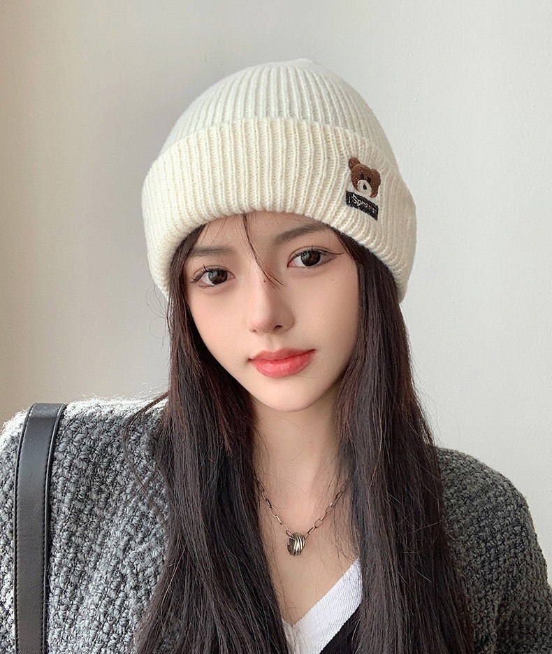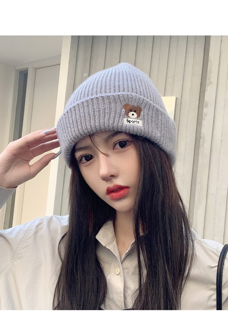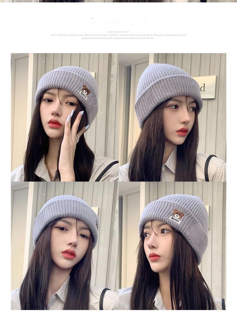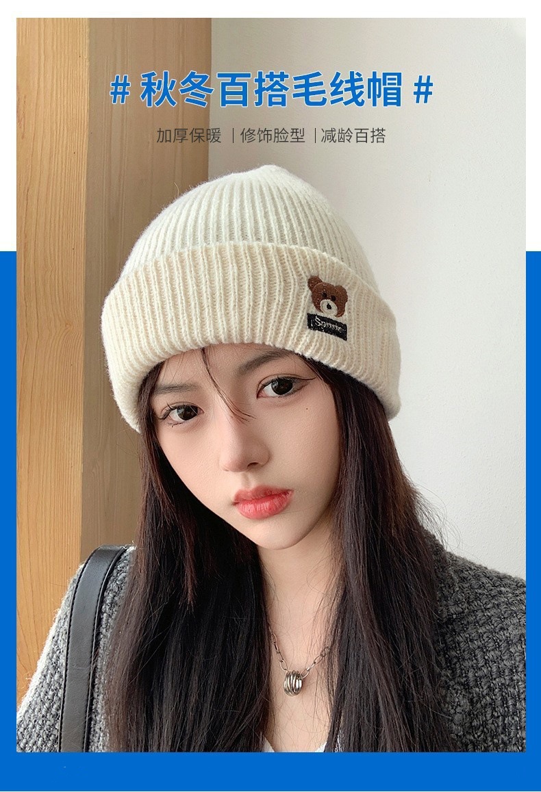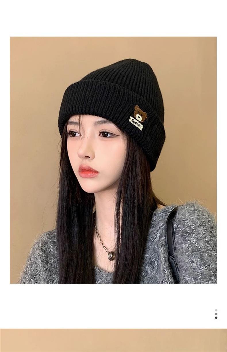 可爱小熊字母针织帽子秋冬新款学生百搭护耳毛线帽洋气月子帽韩版